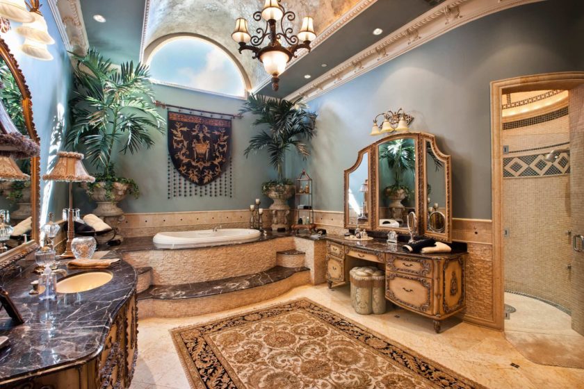 You can easily recognize a bathroom in this style by seeing dark wood furniture.