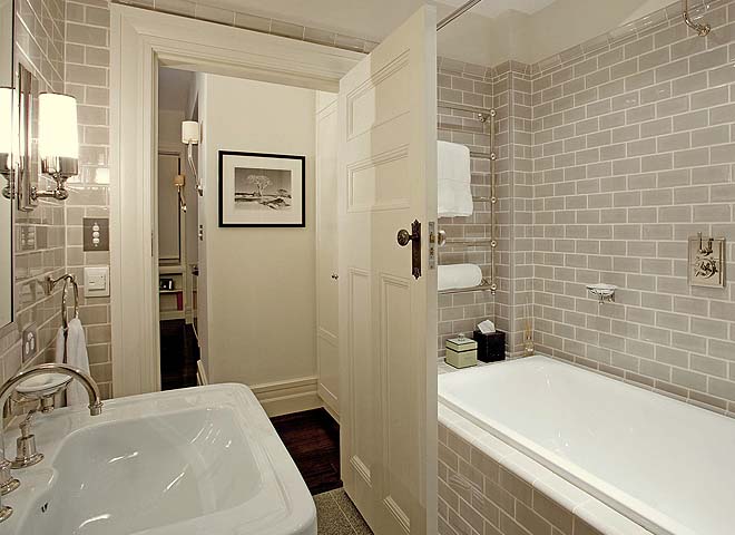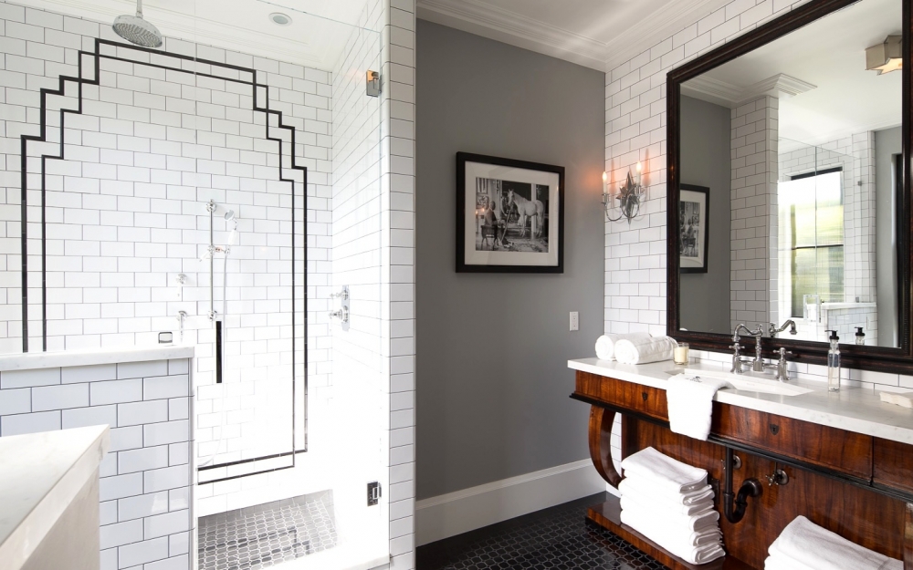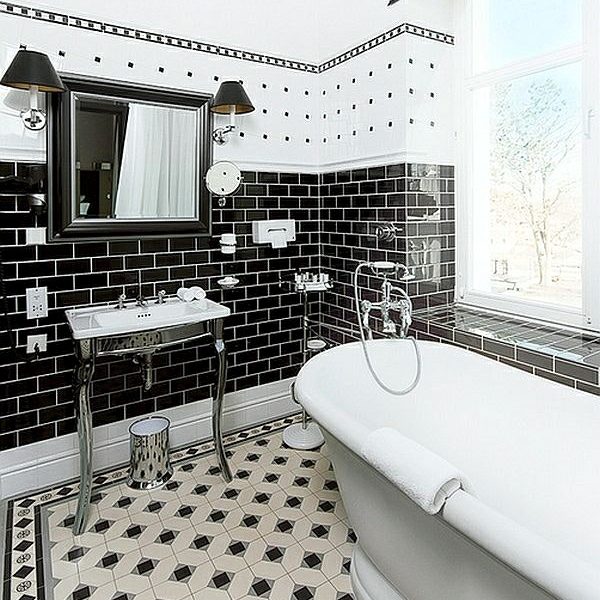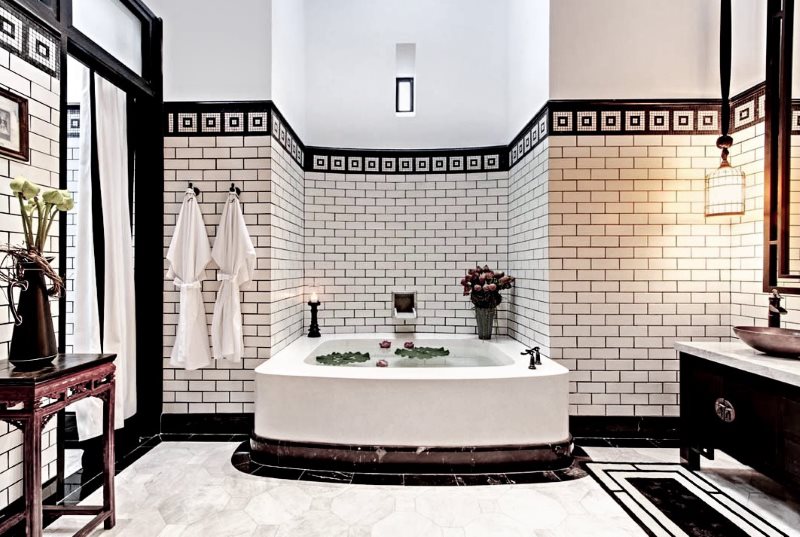 - Art Deco. A style in which order, strict lines and geometricity are important. For this reason, imitation of bricks is optimal here. Most often, the choice falls on a white or black tile, but shades of gray are also allowed. In such an interior, boar and stucco tiles will blend well.