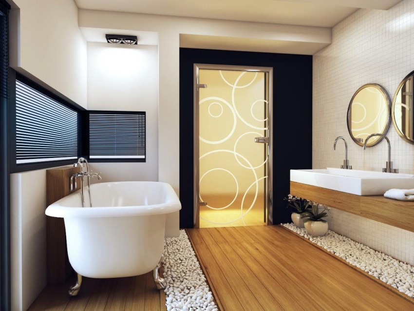 A polished round pebble laid in a wooden pallet fits perfectly into the space of the bathroom, the blue color will give the marine theme a lively mood. You can also do with moss, which grows well in a warm and humid microclimate.