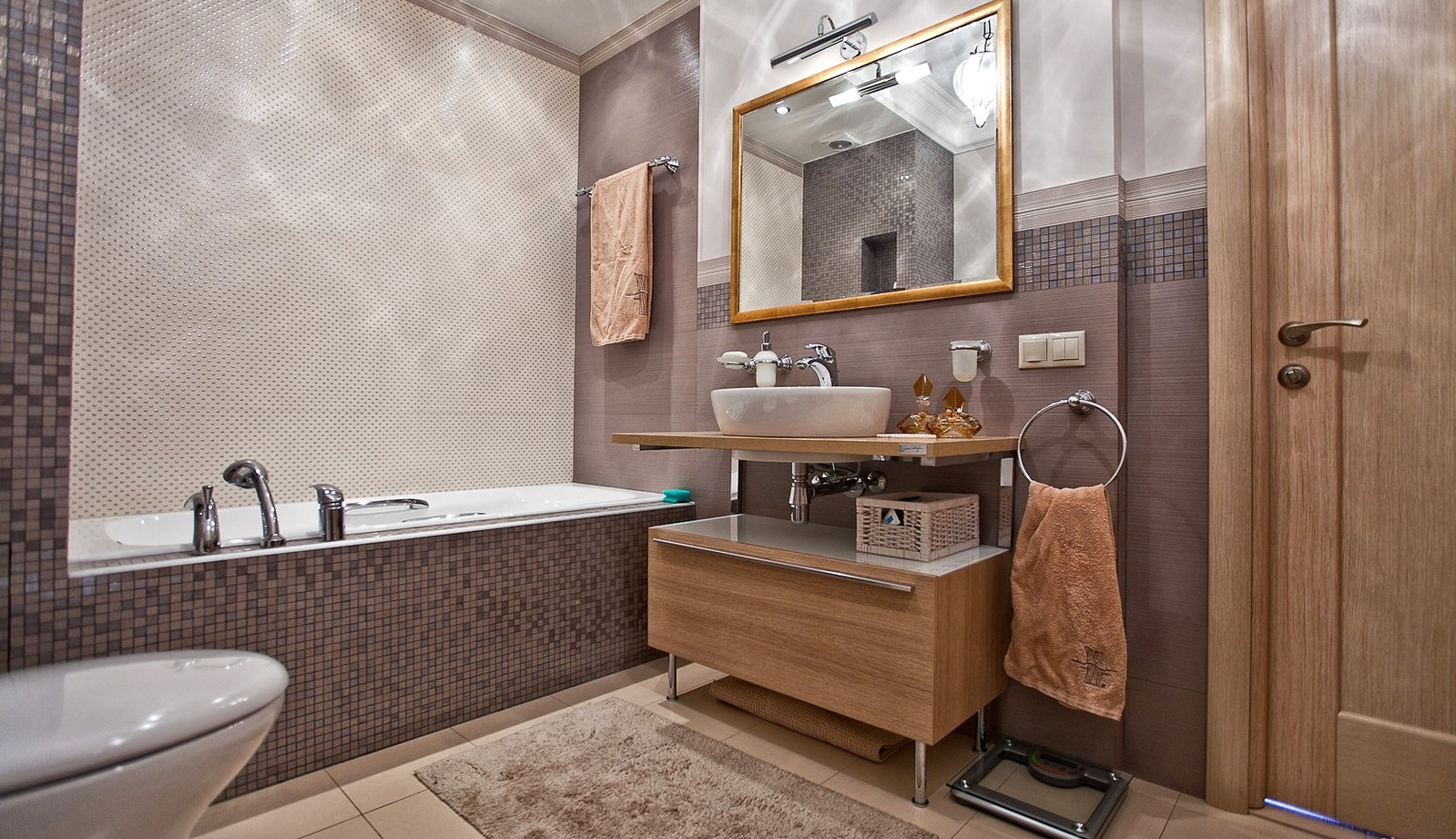 The combination of various shapes and sizes allows you to beat the interior of the bathroom.
