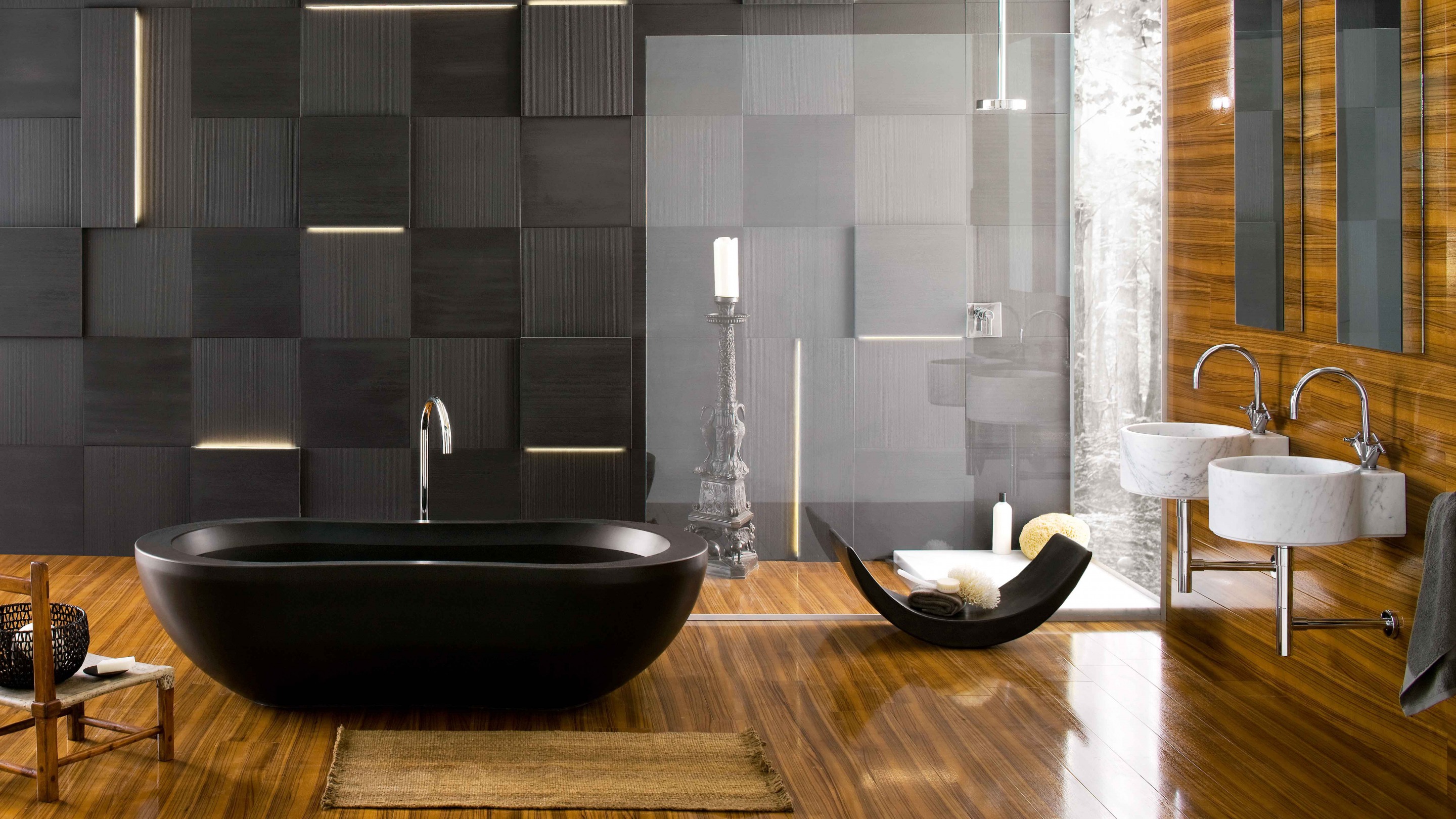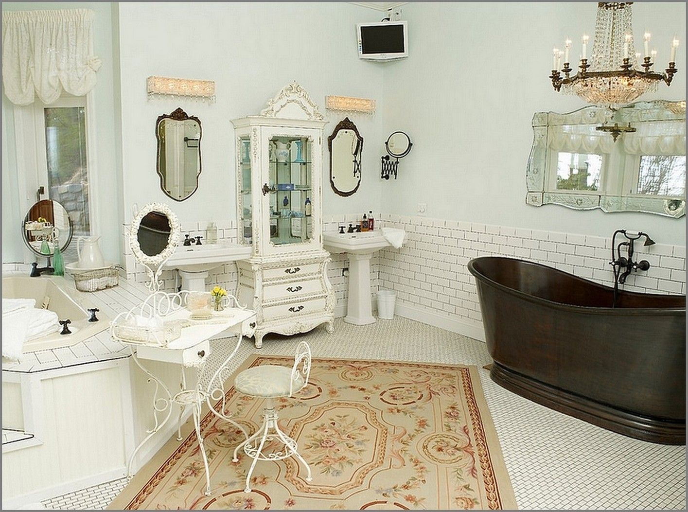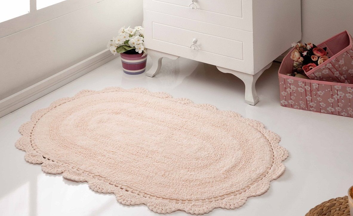 Triangles, polygons, islets will enliven the interior. A large round carpet in the middle emphasizes the cleanliness and richness of the room. If the bathroom is small, you can get by with several oval or rectangular models next to the wash basin and shower.