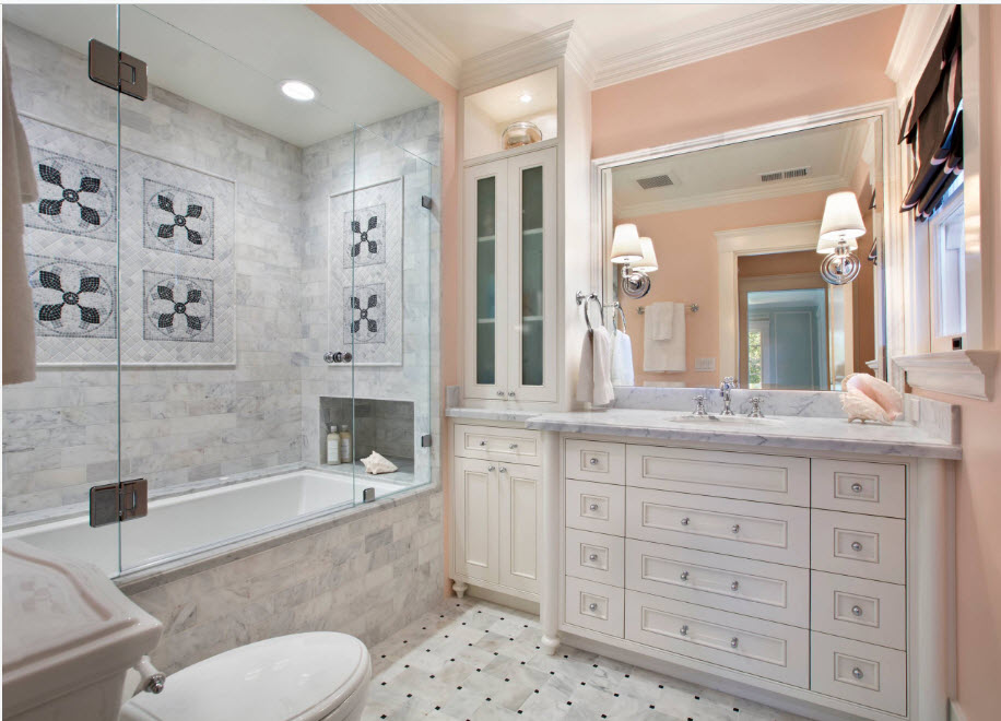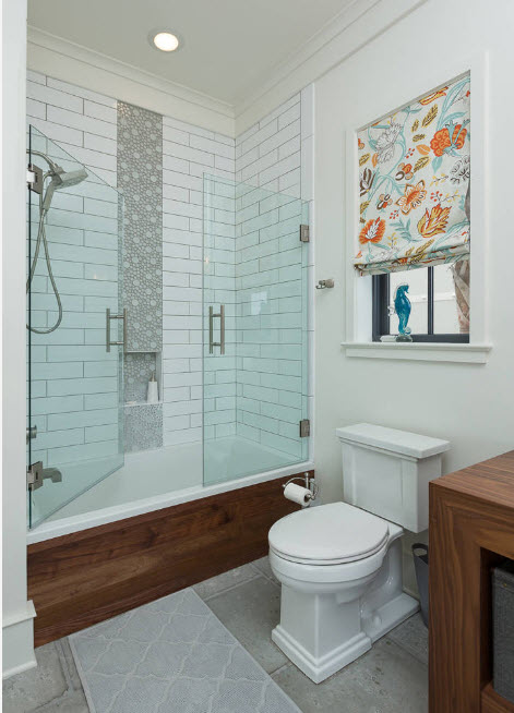 If desired, you can choose a soft curtain if it organically fits into the interior after major repairs. Often they do not harmonize with the modern concept, plumbing and finishing materials. Of course, you can find a water-repellent screen in an interesting design of washable fabric, vinyl or colored plastic, but they are inferior to glass in many ways.