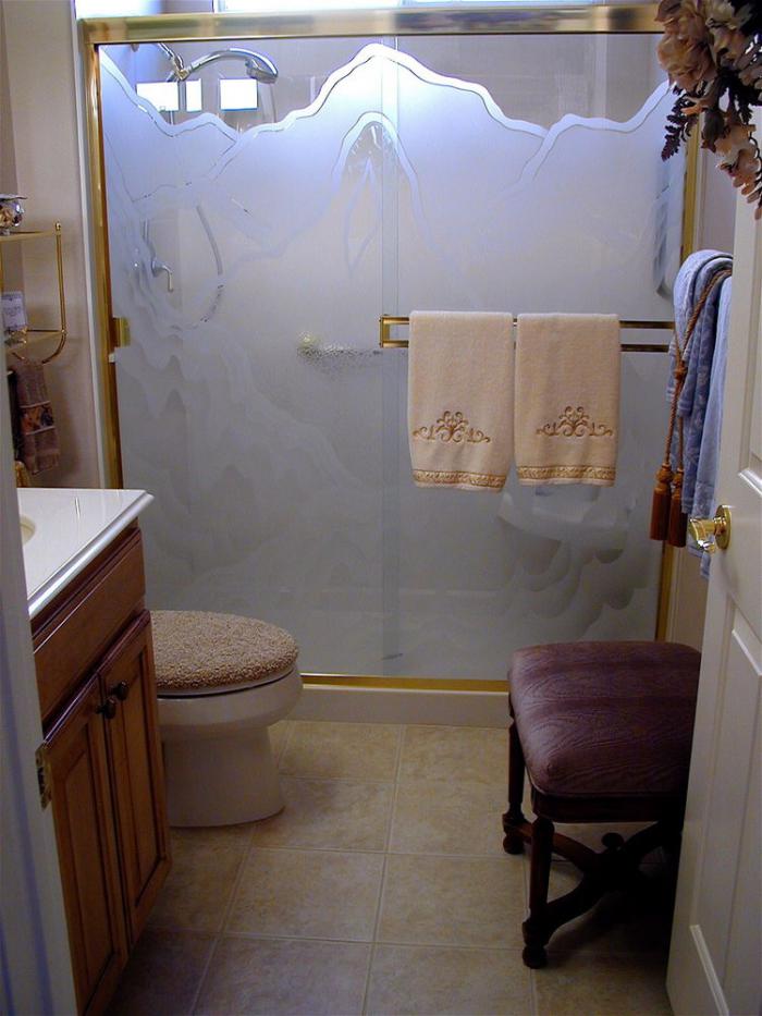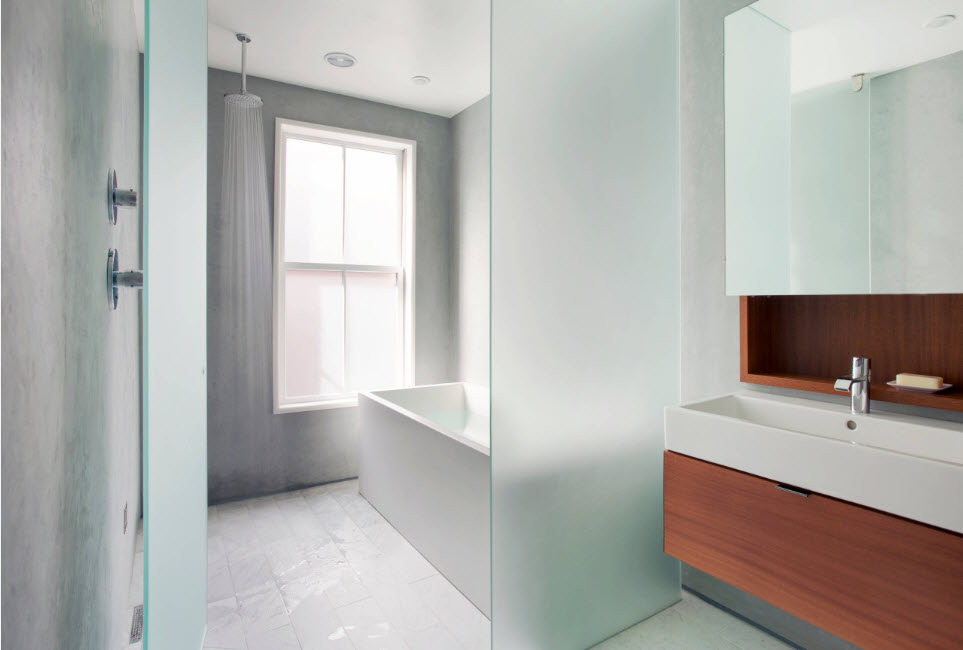 Frosted glass conceals an excess of light, which is important in bathrooms with large-format windows.