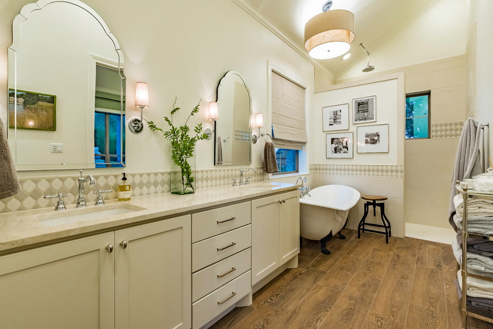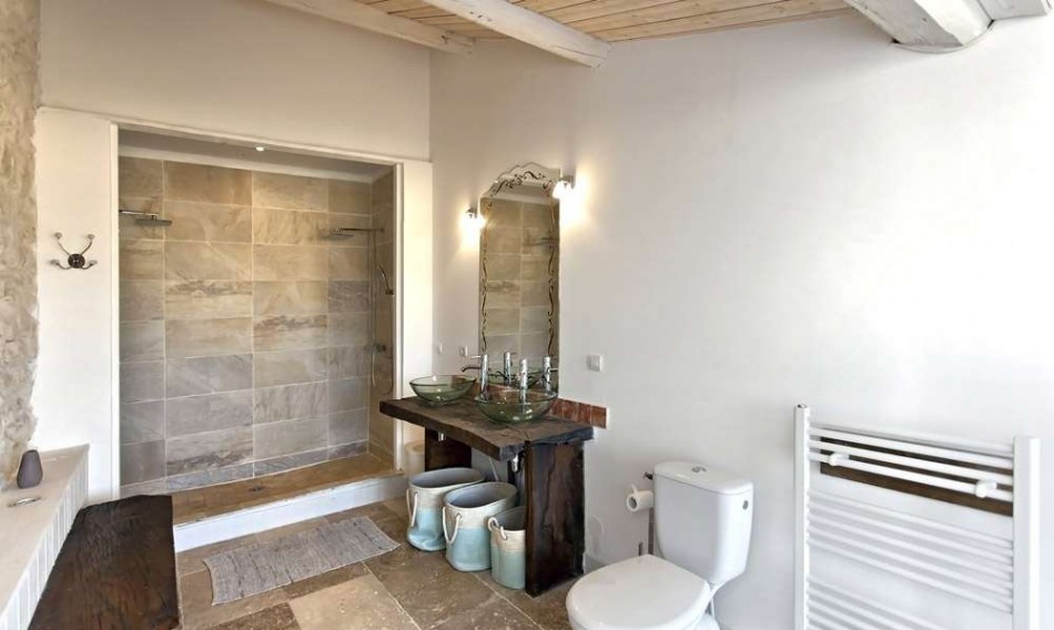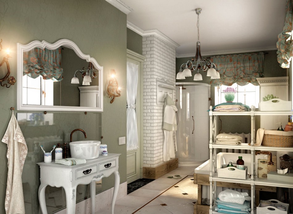 The charm and sophistication of French Provence combines lightness, airiness and sophistication. The rustic theme implies the presence of decor and fabric with a natural pattern and natural decoration material, which completely transfers the bathroom to the Mediterranean coast.