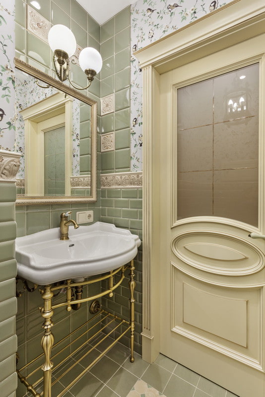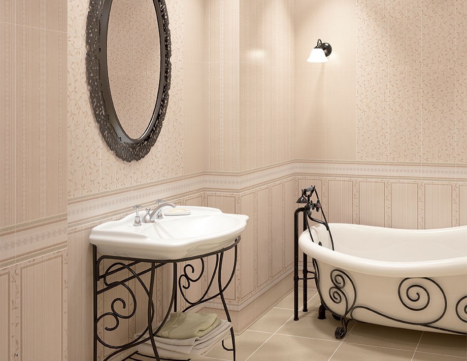 Choose a light wallpaper or tile with a fine pattern. The bathtub and sink should be simple in shape, preferably recessed. The shower cabin will ideally fit into such an interior.