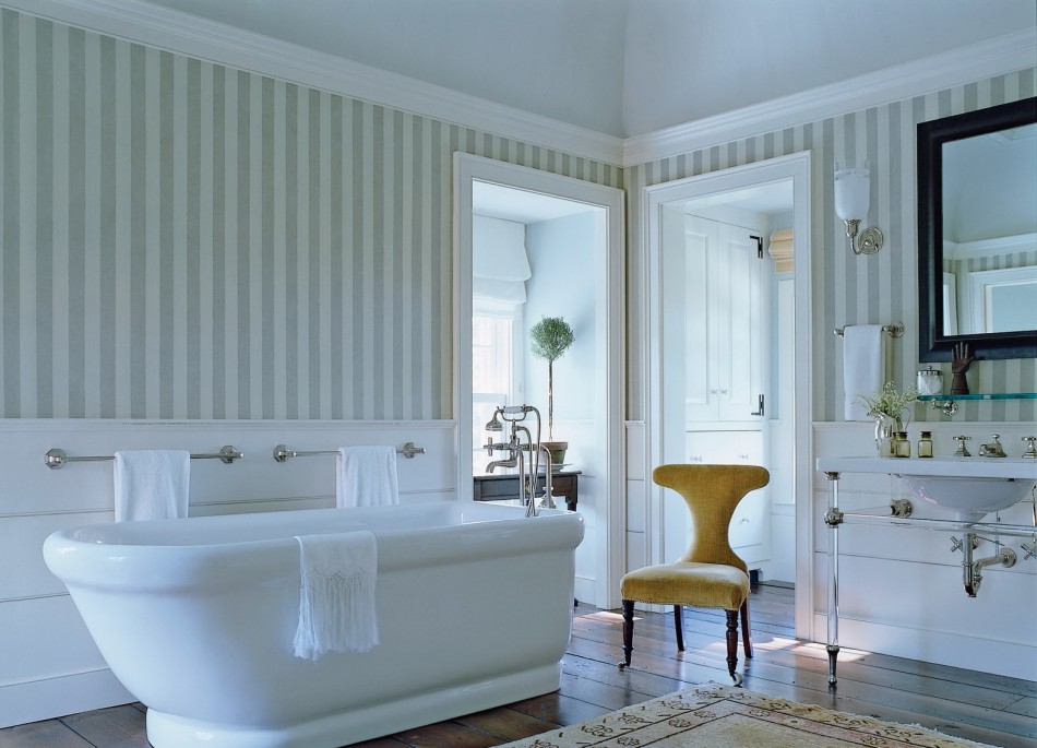 Vertical stripes on the bathroom wall visually raise the ceiling of the room