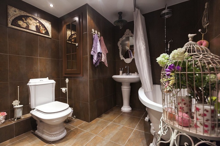 The bathroom, decorated in the Provence style, has a certain rustic image of decor, with simplicity and grace at the same time. The interior is definitely dominated by light, light shades with flowers and other floral-natural ornaments. For a small room, this design is difficult to reproduce, in which case, it is better to consider the connected bathroom.