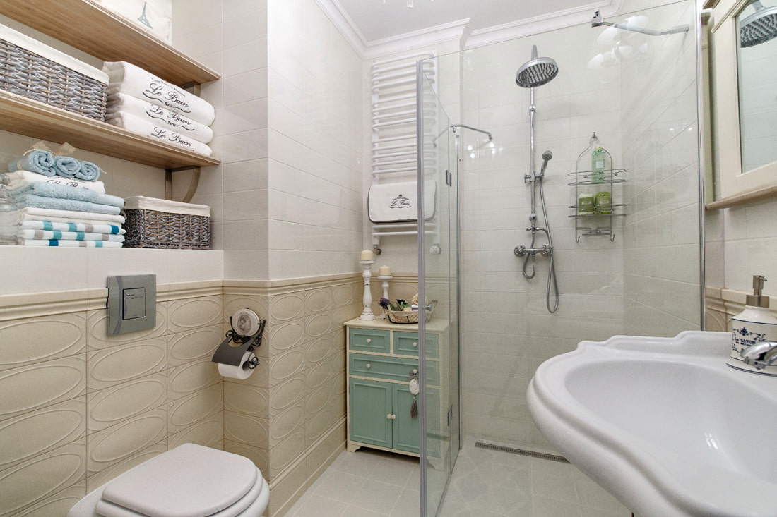 A Provence bathroom is usually filled with warm and pastel colors. Mostly used white, cream, pink, lavender, olive and pearl. These shades relax as much as possible, relieve tension and immerse yourself in a wave of serenity and enjoyment of peace.