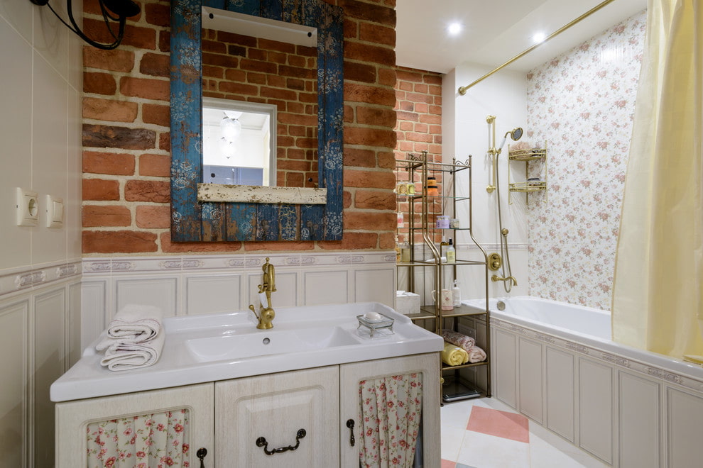 Finishing in the bathroom can be simplified by whitewashed boards, plaster and a brick wall. However, in a small bathroom it is worth using ceramic tiles with floral prints or floral designs. The main background should be pastel: light blue, light green, beige, white. Modern manufacturers offer a wide selection of tiles of various colors: from the colors of the sea lagoon, green grass to the glare of sunlight.