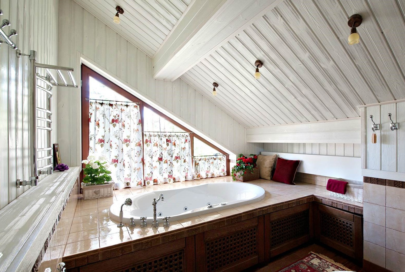 The walls can be laid out with ceramic tiles or wood panels, also painted in pastel colors with paint or decorative plaster. Walls treated with stone, stucco, brick look perfect.