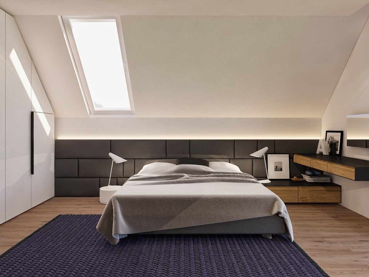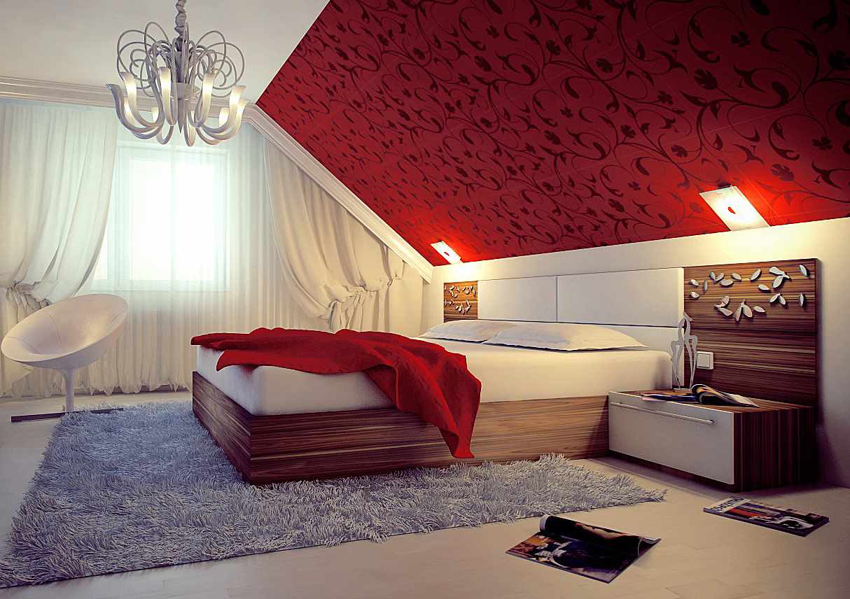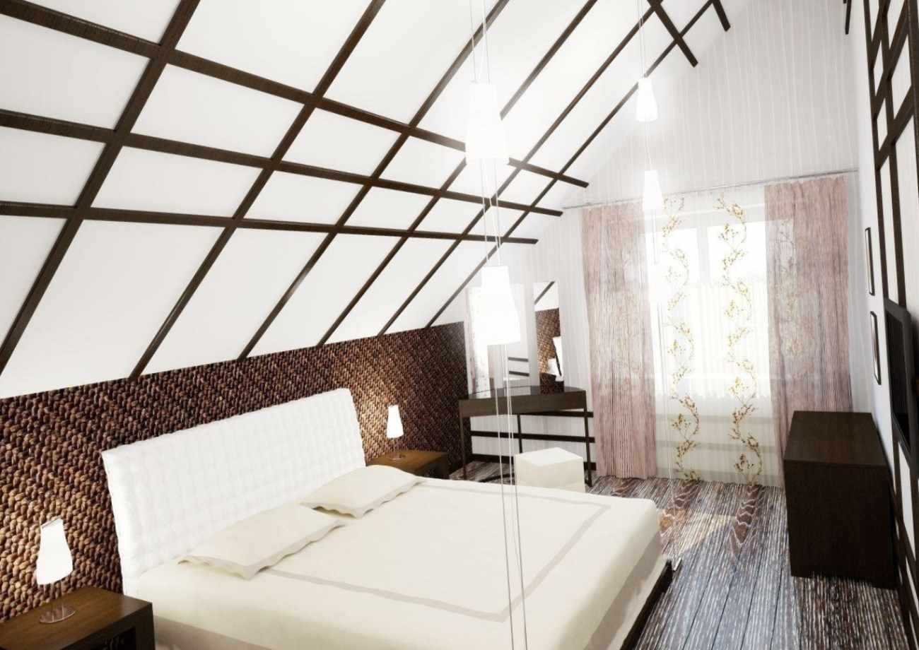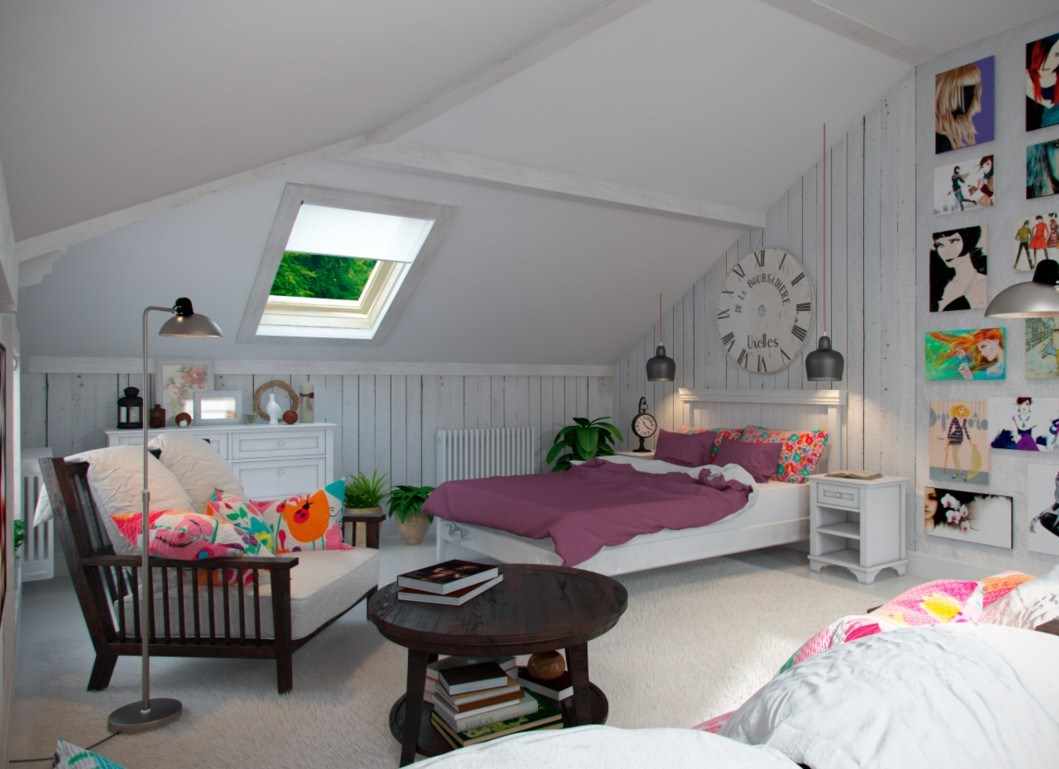 A spacious attic can be designed by mixing light, dark shades. The main thing to remember is that the bedroom should be comfortable, too saturated walls will prevent falling asleep, excite the nervous system.