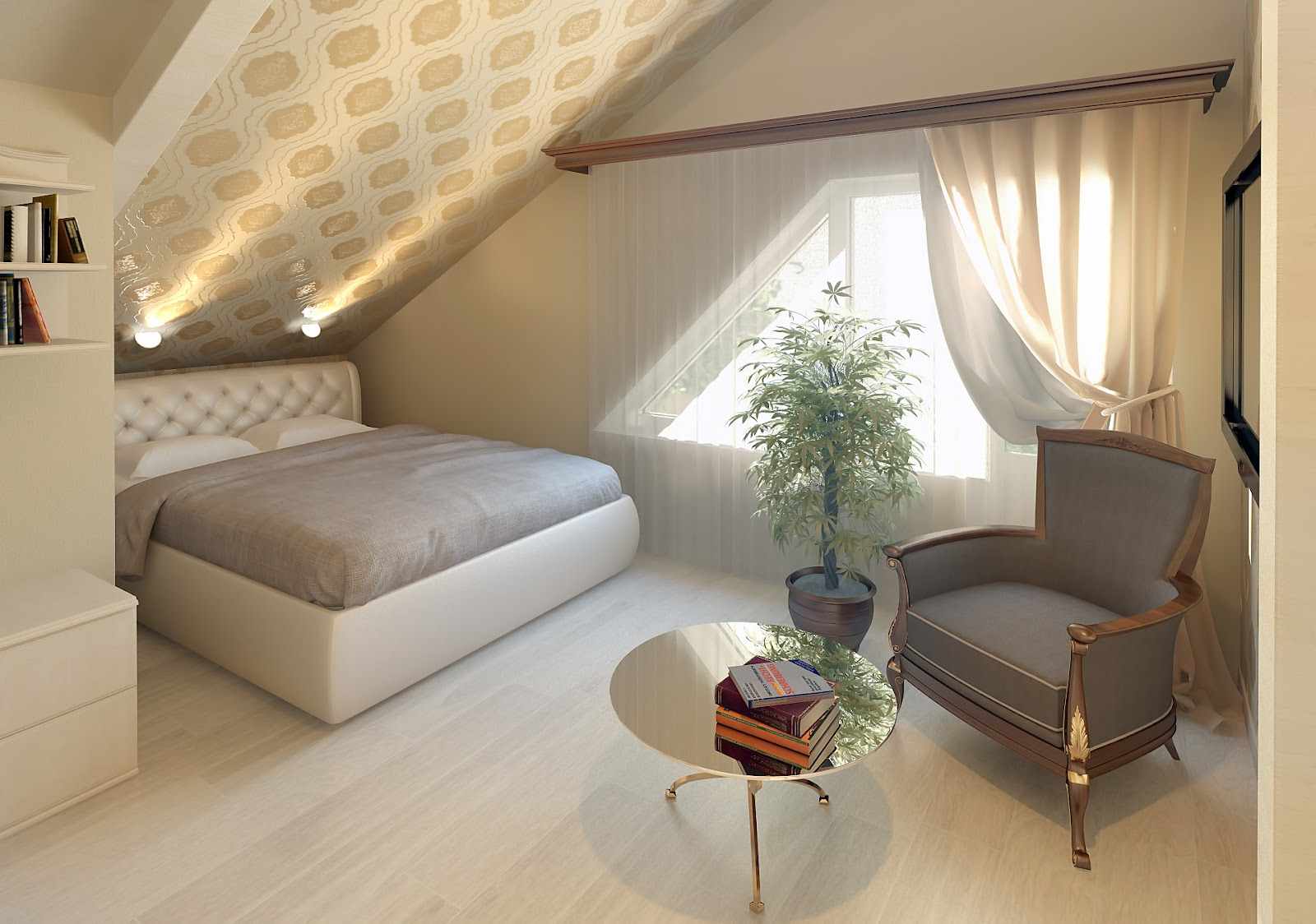Beige bedroom in the attic will be a great place for privacy and relaxation.