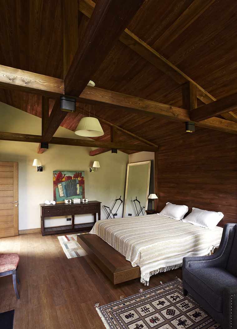 Pay attention to the quality of building materials, their safety. In the bedroom you will spend about a third of your life. It is dangerous to breathe harmful resins and fumes in a dream. Do not save on the purchase of building materials! An excellent solution would be the use of wood in large quantities. Natural wood has an excellent appearance, practical in the process of operation, useful for humans. Even after careful processing, the tree releases beneficial substances into the air.