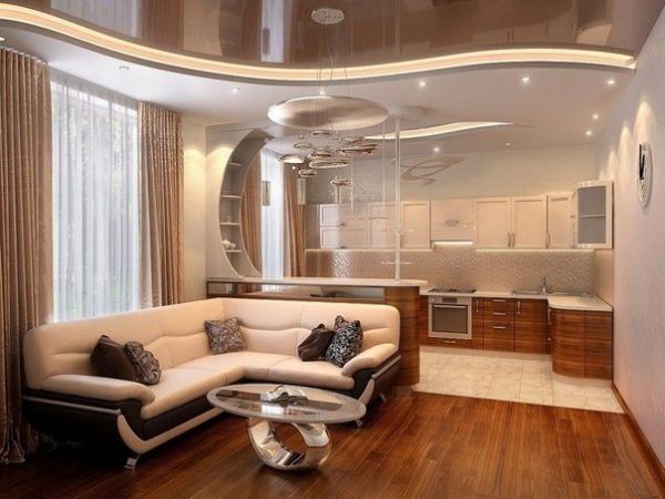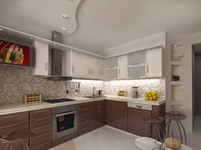 Una solución popular son las paredes ligeras y una unidad de cocina de chocolate. Es muy hermoso si el color de las paredes tiene un tono cálido y cremoso. Tal cocina parecería más espaciosa.