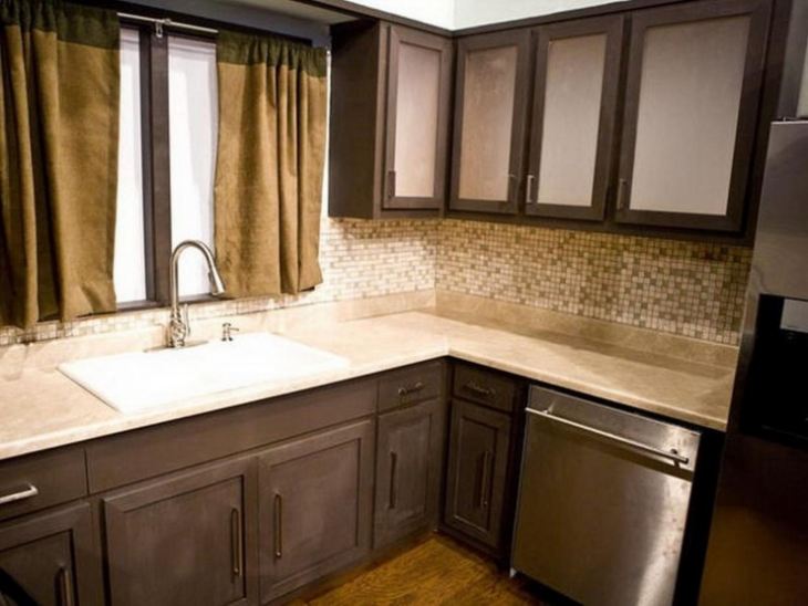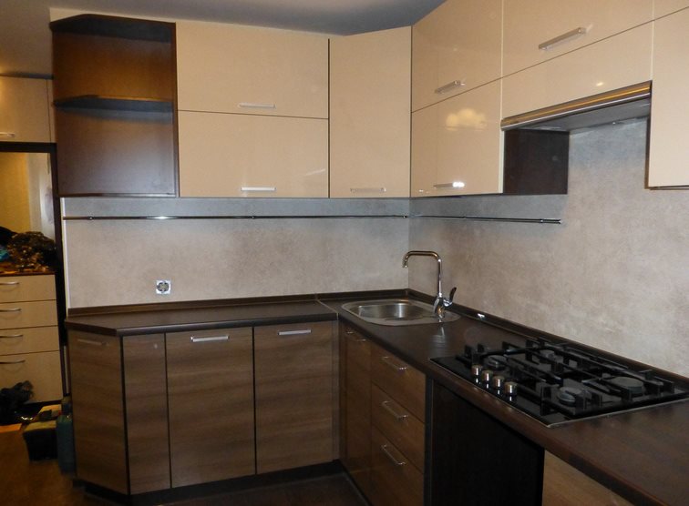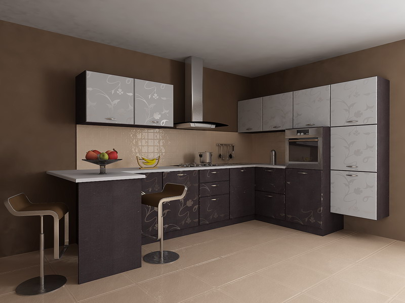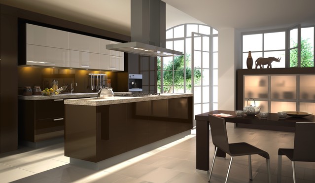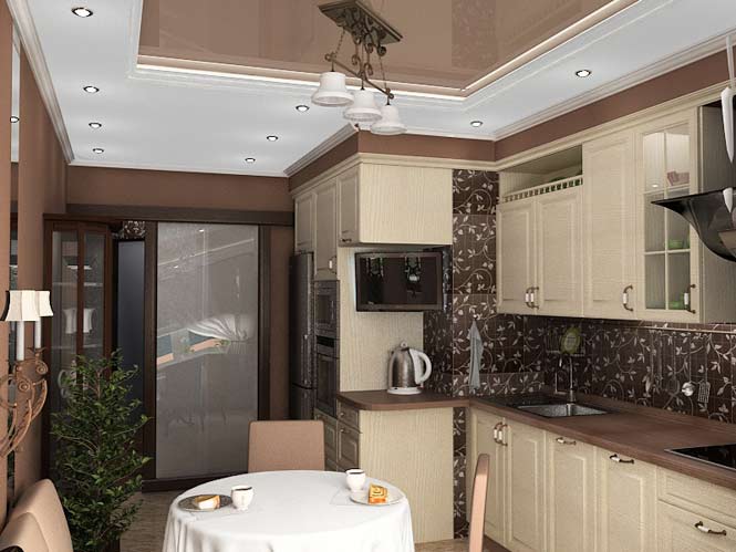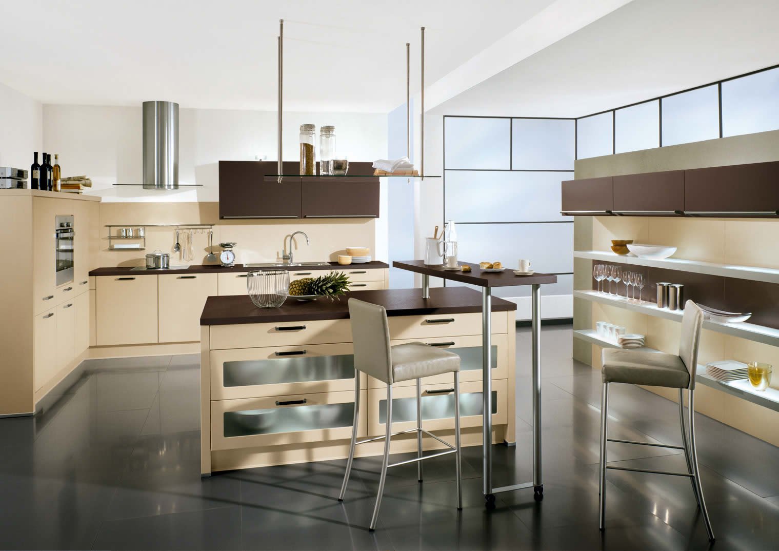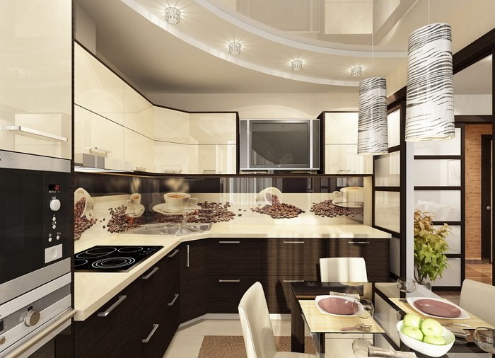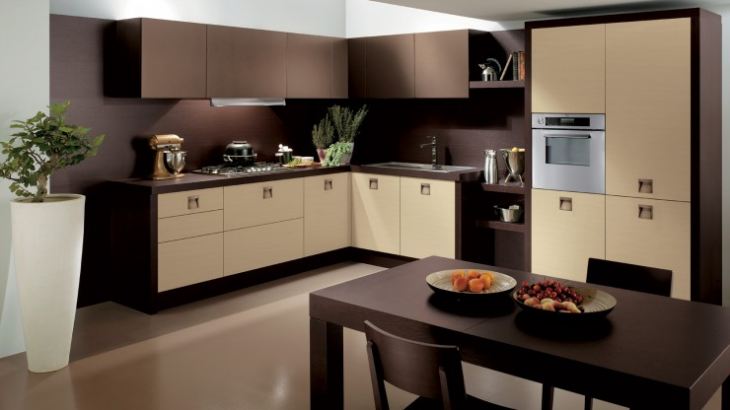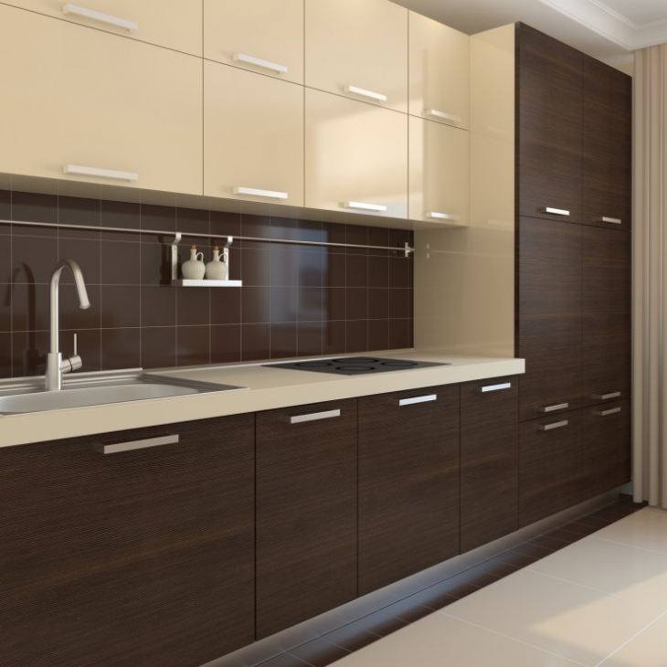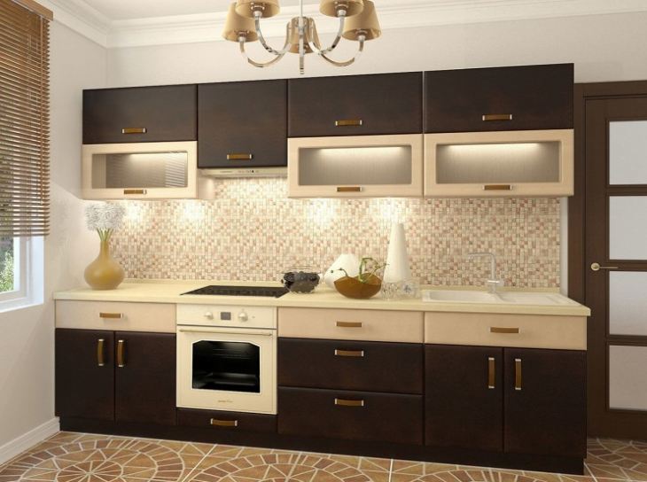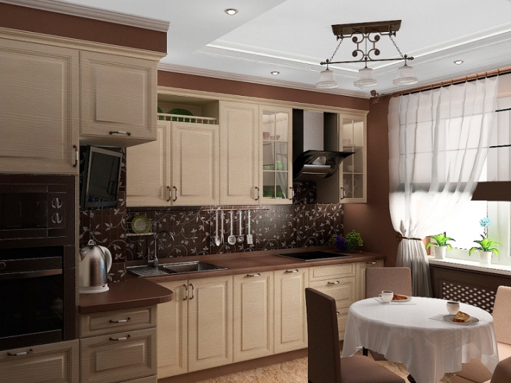 - Cocina de chocolate sobre un fondo de paredes de color beige: el diseño óptimo para la cocina