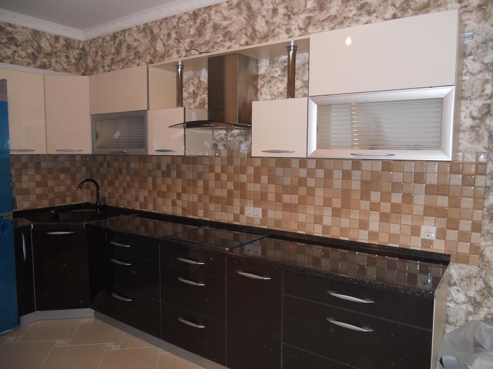 Cocina de estilo moderno con mueble de cocina blanco y decoración de paredes de chocolate.