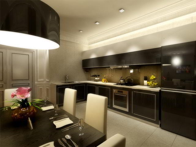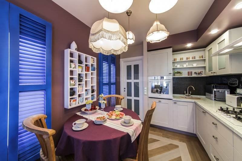 - El piso, el techo y las paredes son oscuros. Esta decisión hace que la habitación sea íntima, acogedora, similar a un estudio. Raramente se usa para cocinas.
