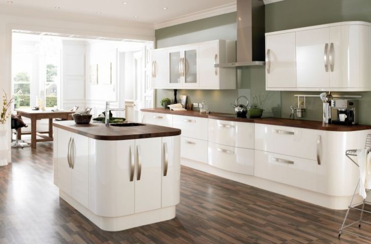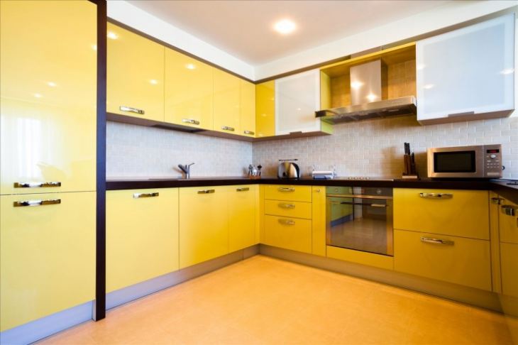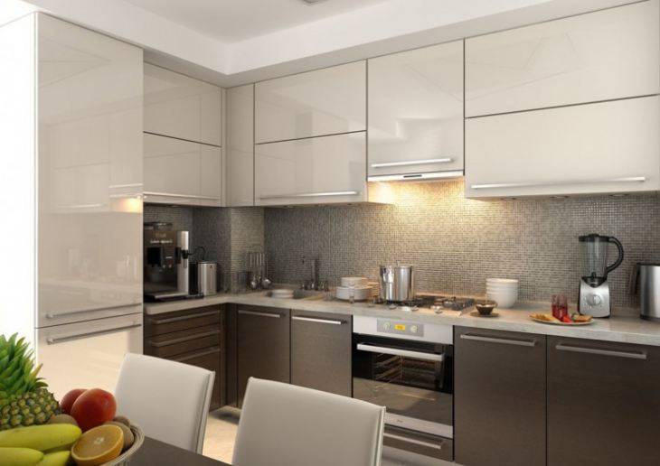 Ampliar visualmente el espacio de la cocina también es posible con el brillo de las fachadas brillantes.