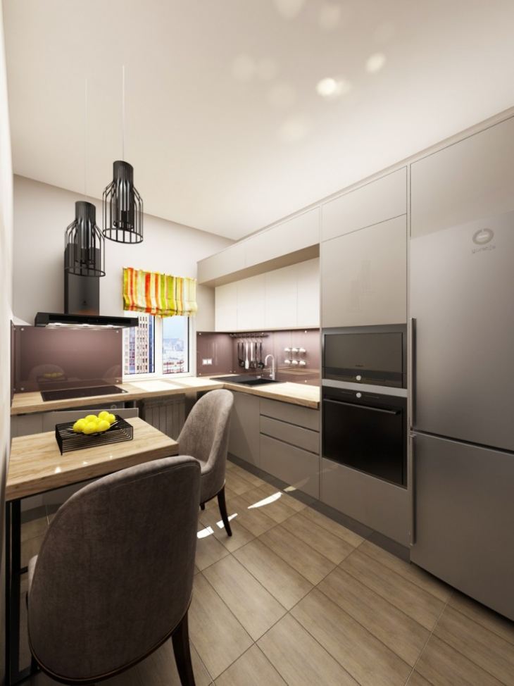 - Empuja visualmente la habitación. Adecuado para cocinas en miniatura o estrechas con ventanas pequeñas.