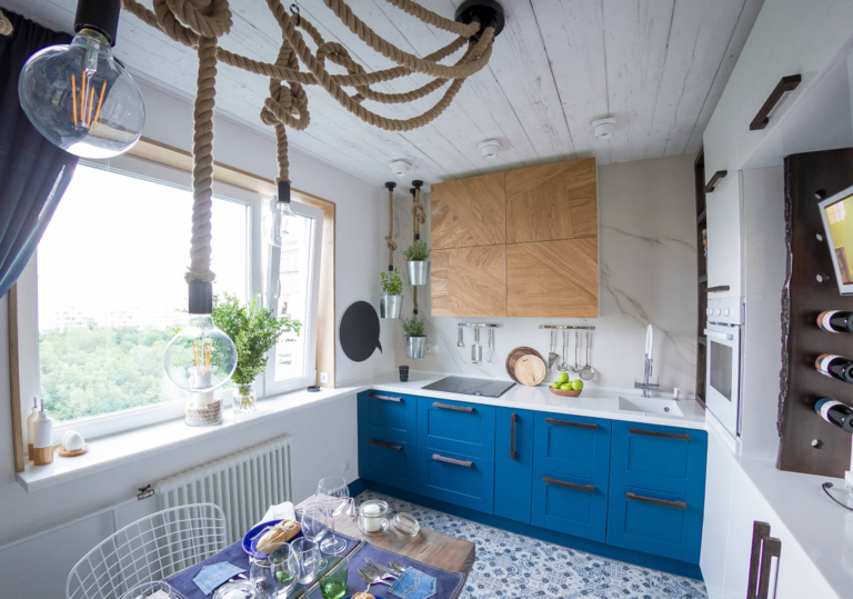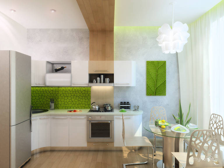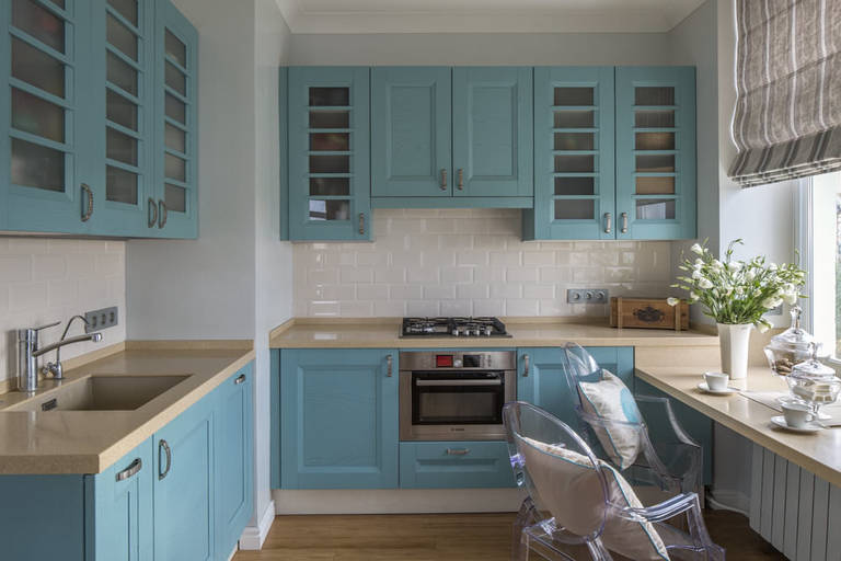 Para cocinas pequeñas, es aconsejable pedir un juego de cocina alta, por razones de ahorro de espacio. En los gabinetes superiores puede almacenar pequeños electrodomésticos.