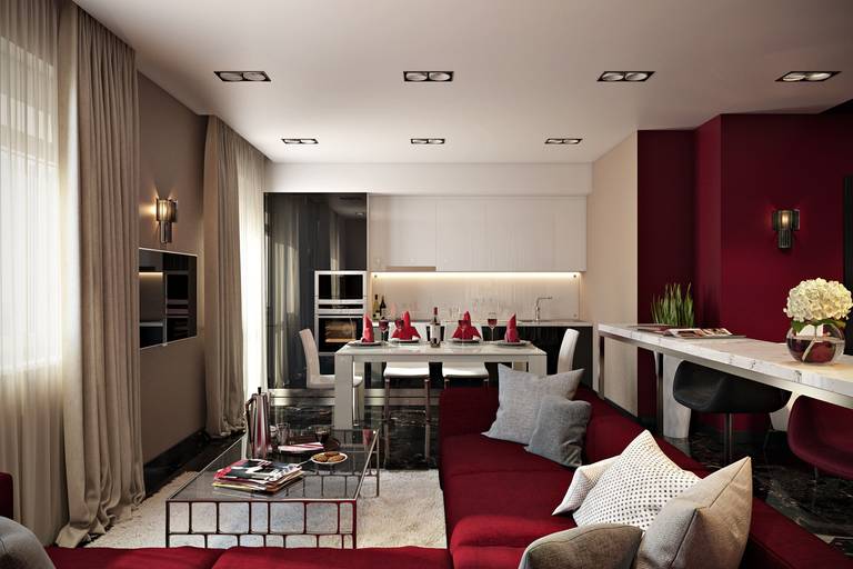 ¡Presta atención! Hay un compromiso: la cocina puede estar parcialmente abierta, pero separada de la habitación por muebles, una partición o una pared. Alternativamente, una habitación larga con un pasillo directo y puertas correderas que le permiten cambiar el espacio y, si es necesario, cerrar y abrir la cocina.