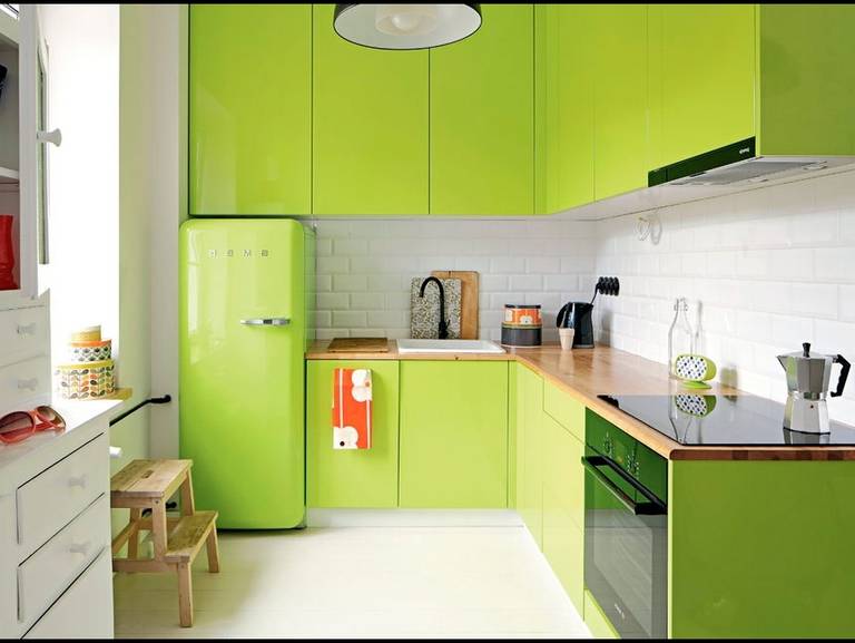 La coloración de las instalaciones de la cocina debe hacerse en soluciones simples y monofónicas, con un mínimo de colores brillantes o patrones multicolores.