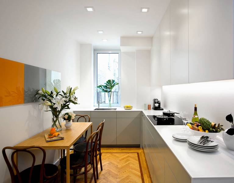 El diseño de cualquier cocina, independientemente de su tamaño, debe esforzarse por la simplicidad, la funcionalidad y la alta tecnología. Los muebles pomposos y voluminosos deben minimizarse.