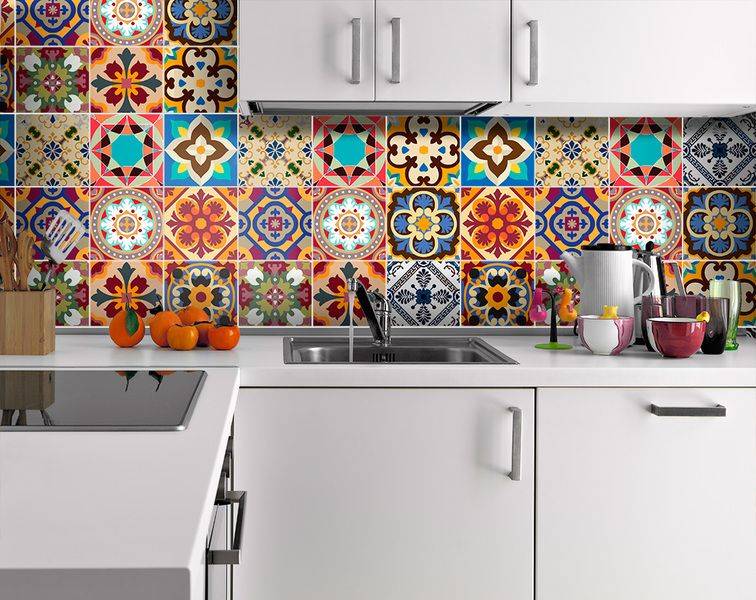 - Barroco: el espacio entre la encimera y los gabinetes colgantes está decorado con coloridos mosaicos;