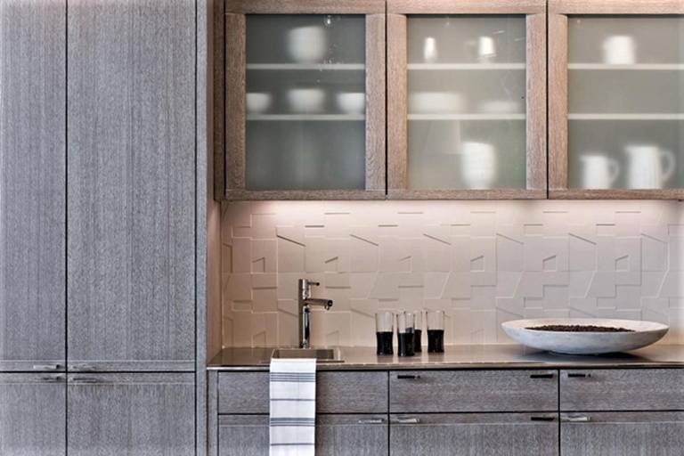Ladrillo blanco o azulejo de la misma forma siempre se ve muy bien entre gabinetes grises.