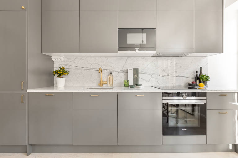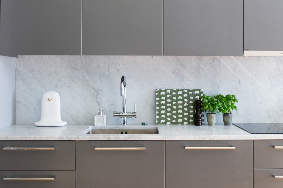 Una combinación de muebles grises mate con un delantal de piedra oculta las huellas dactilares y las marcas de salpicaduras.