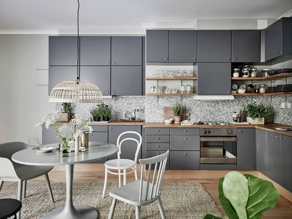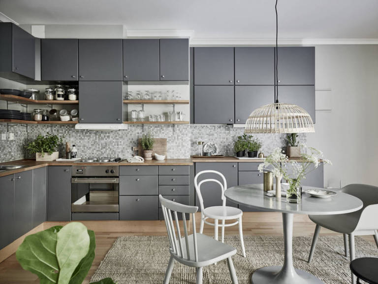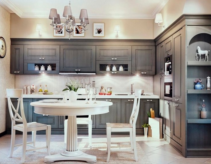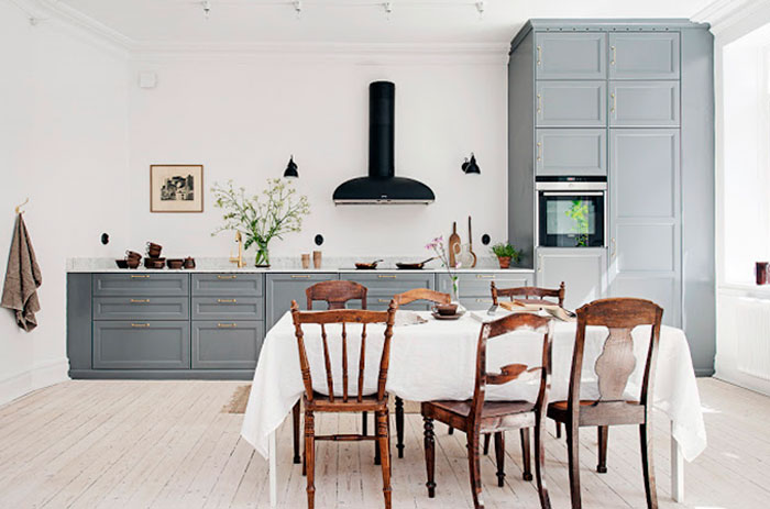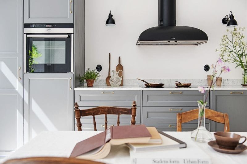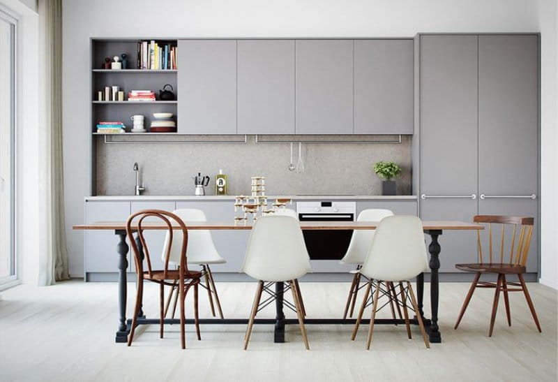 Para que los tonos grises no hagan que la cocina sea demasiado sombría, es mejor recortar las paredes en blanco o beige