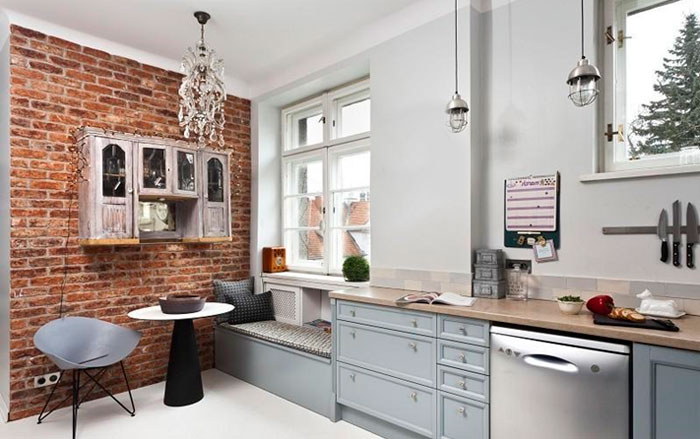 Una combinación interesante de ladrillo y azulejos ligeros en el interior de una cocina.