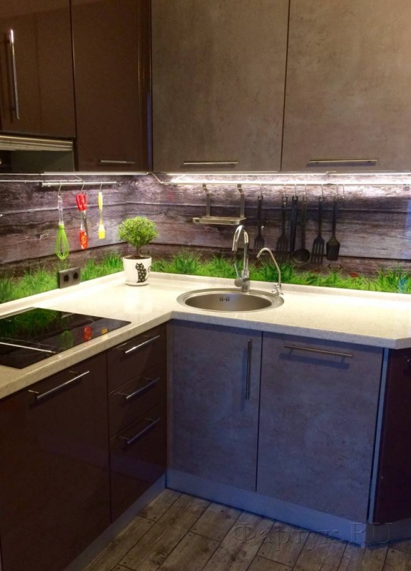 Si hay un problema, cómo elegir un delantal para un juego de cocina, generalmente recurren a muestras de fotos de varias revistas de diseño. Es importante recordar que el fartuk es el área más problemática de la habitación: cuando se cocina se obtiene agua, grasa, trozos de alimentos cocidos, diversos líquidos. El delantal se debe lavar fácilmente de todo esto, porque los materiales se seleccionan de manera adecuada: vidrio, piedra natural, plástico, cerámica, etc.