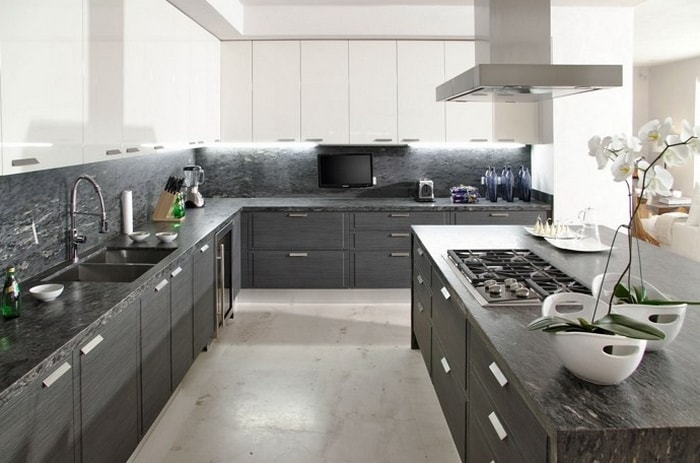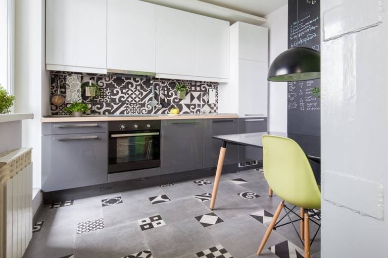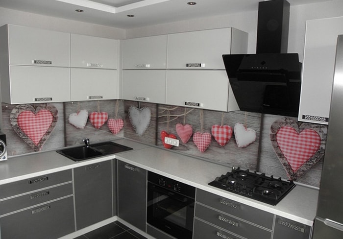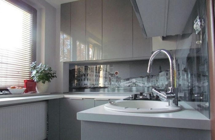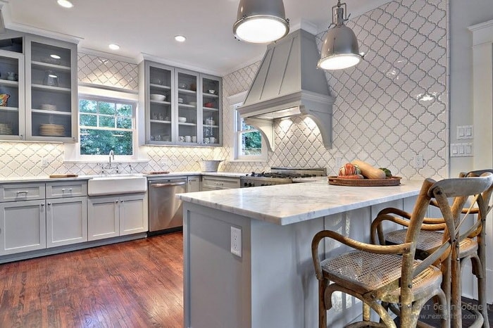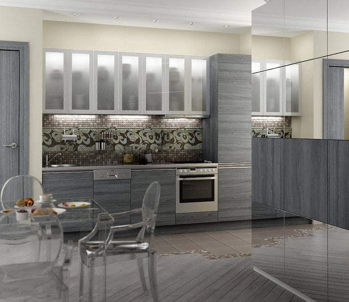 - Soluciones interesantes de diseño de delantal para una unidad de cocina gris (selección de fotos)