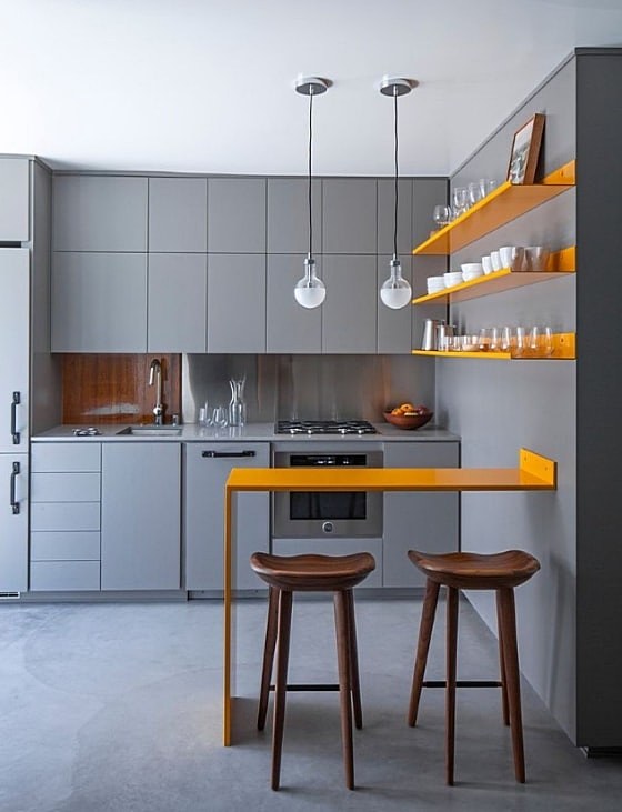 Con estos tonos, el delantal generalmente está hecho, mientras que el resto del interior es completamente gris: el fartuk será el único acento de color en la habitación. Cuando la cocina se combina con la sala de estar, el delantal se convierte en un elemento de zonificación completo, que separa el lugar de cocción; luego, simplemente es necesario resaltarlo con color.