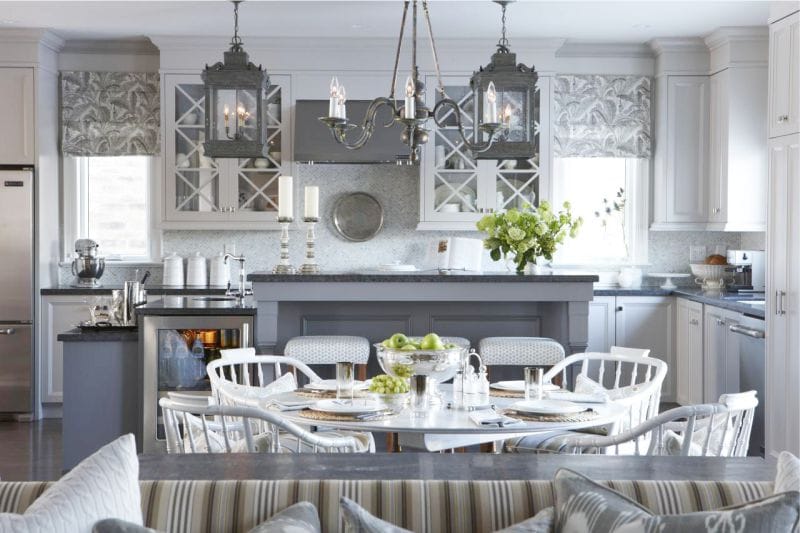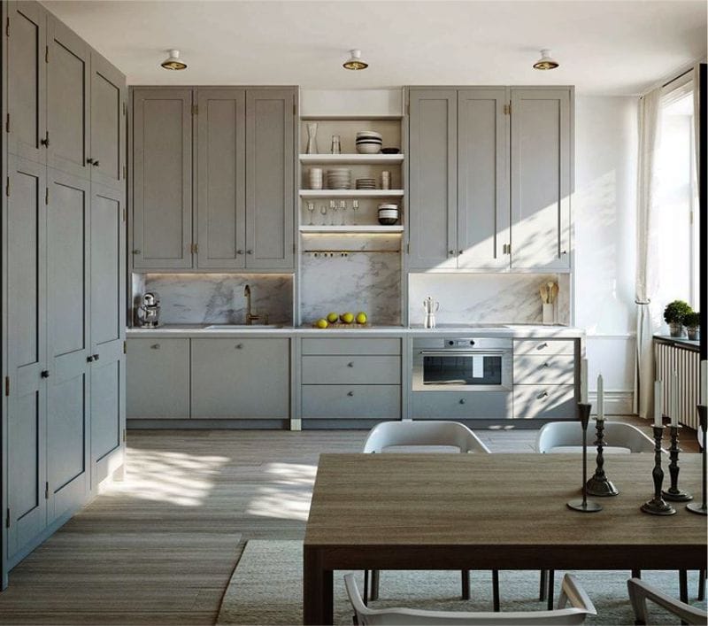 Una versión mate de color gris ceniza es ideal para interiores de estilo neoclásico, nácar brillante para art deco, asfalto para estilo tecnogénico, azulado para una cocina romántica. La combinación de gris cremoso con rosa pálido, índigo, verde esmeralda se ve muy hermosa. Los estampados de ajedrez blanco grisáceos en el espacio sobre la encimera se ven frescos, originales: este diseño no estará desactualizado muy pronto.