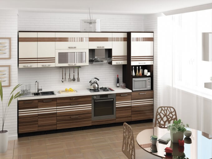 - Las dimensiones del espacio de cocina en el apartamento. No intente identificarlos a simple vista. Toma medidas precisas. Si la habitación es un poco pequeña, entonces los muebles se seleccionan de manera apropiada, por ejemplo, gabinetes y estuches, que se adaptarán a los electrodomésticos, así como a todo tipo de transformadores (elementos deslizantes, deslizantes, reclinables).
