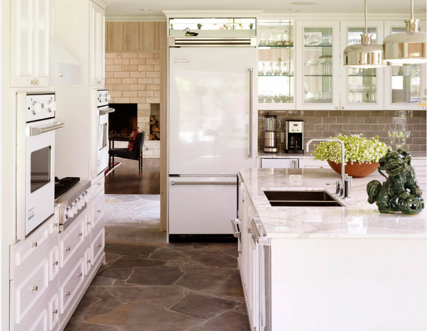 Los diseñadores recomiendan poner unidades de refrigeración blancas en la cocina con un interior clásico brillante.