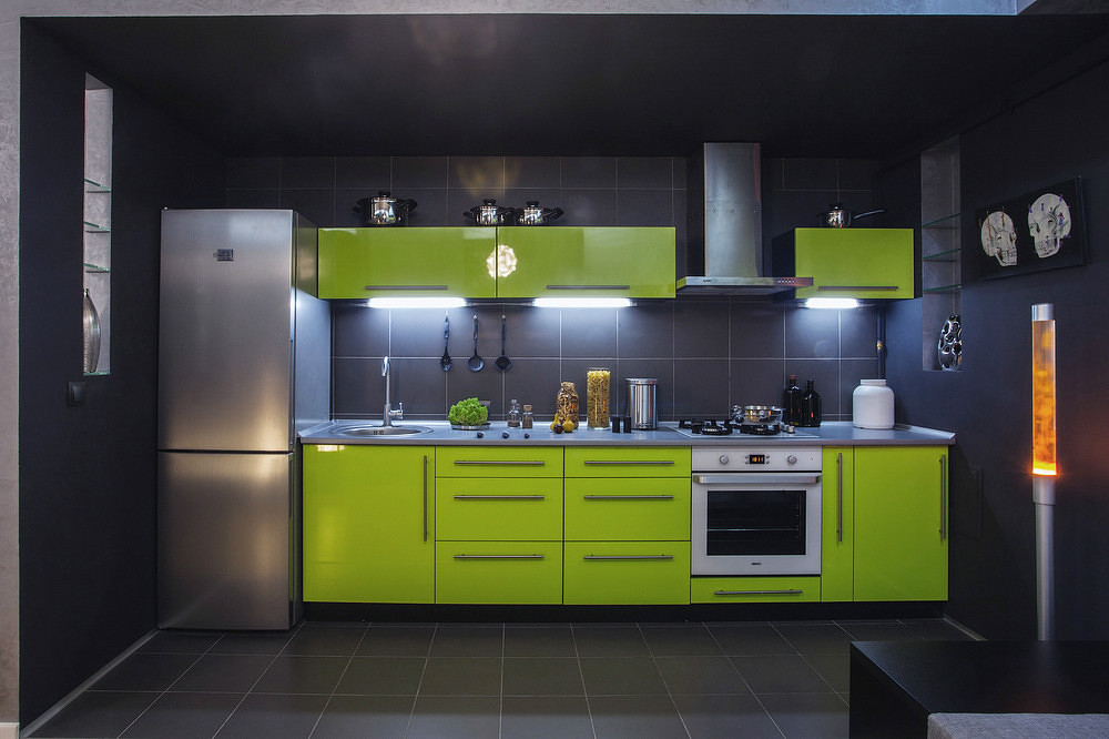 Este arreglo es perfecto si la cocina no es grande. Muy a menudo en este caso, el refrigerador se encuentra al lado de la entrada, pero al mismo tiempo permanece cerca del fregadero. Si elige el modelo correcto, realice medidas cuidadosas, el equipo se alineará con el auricular y no se destacará.