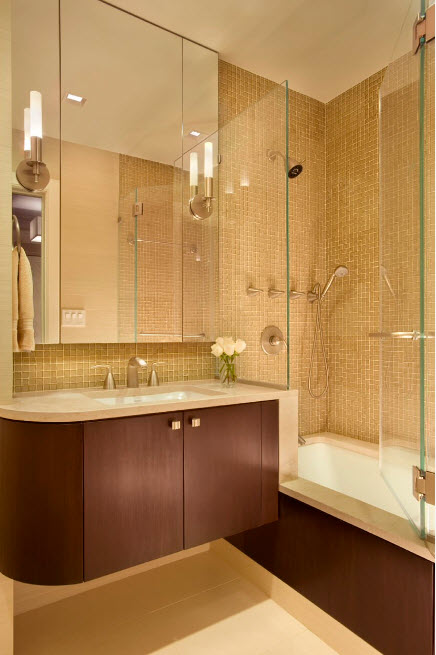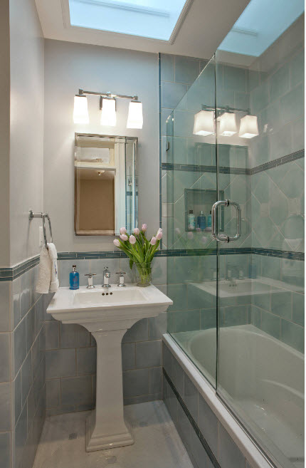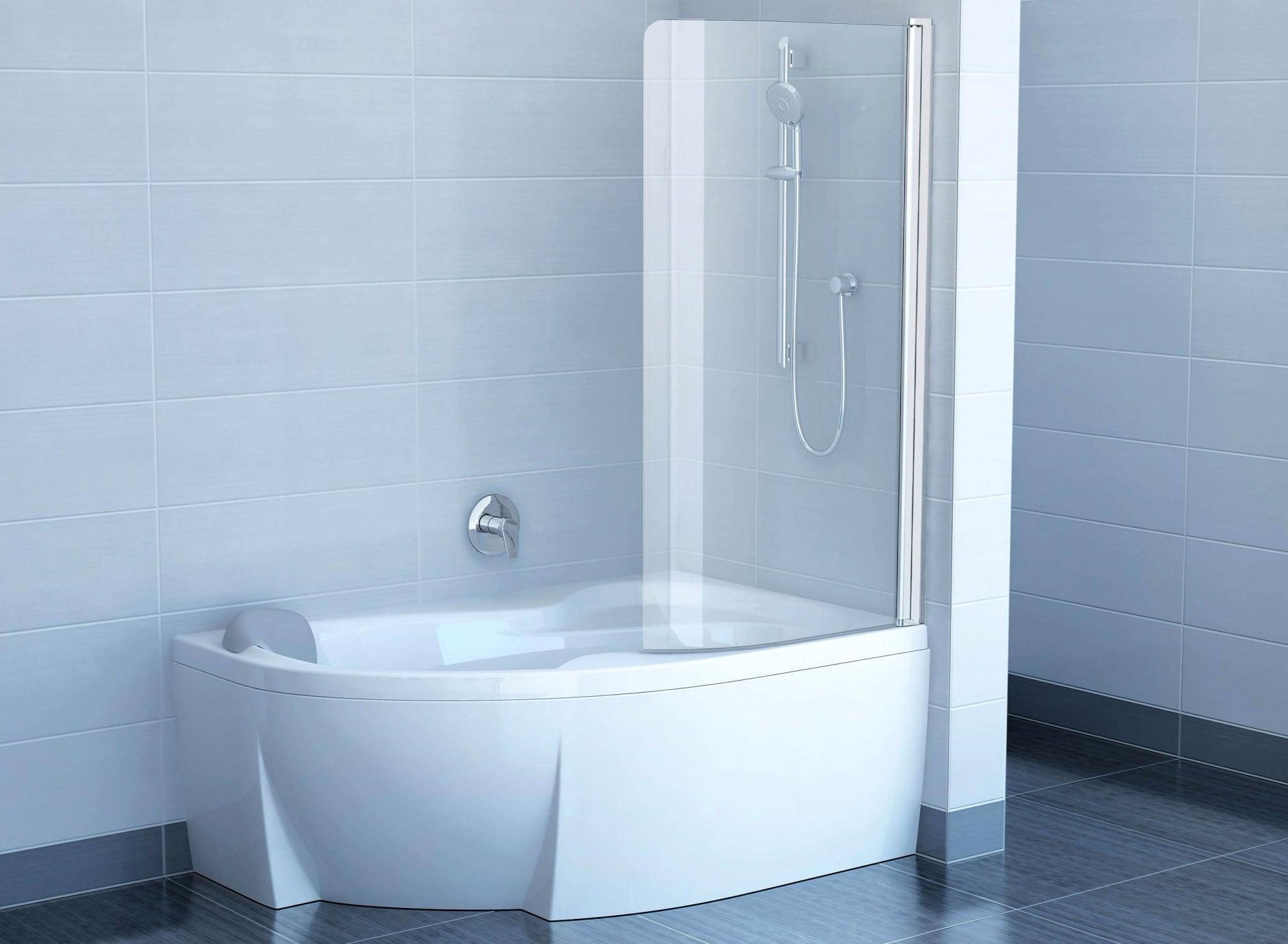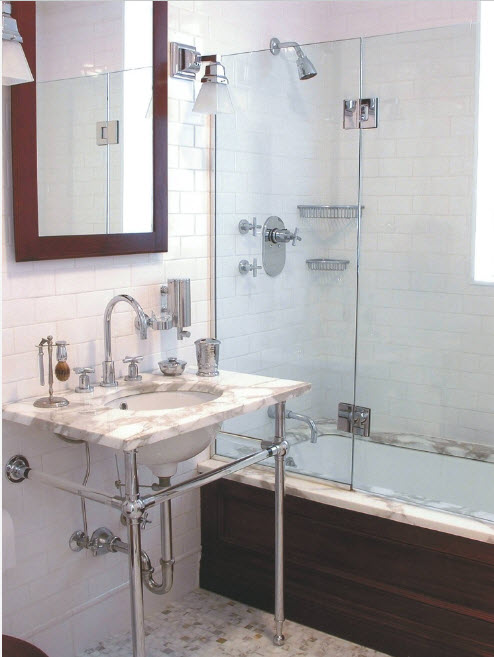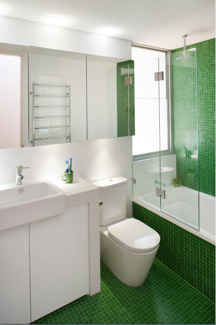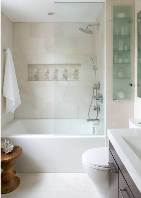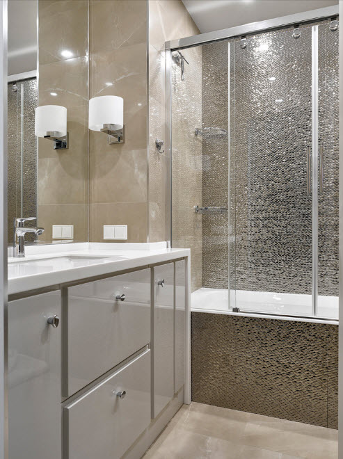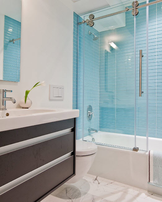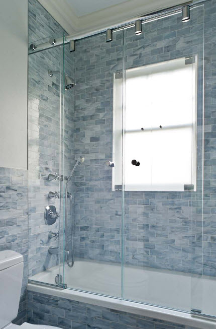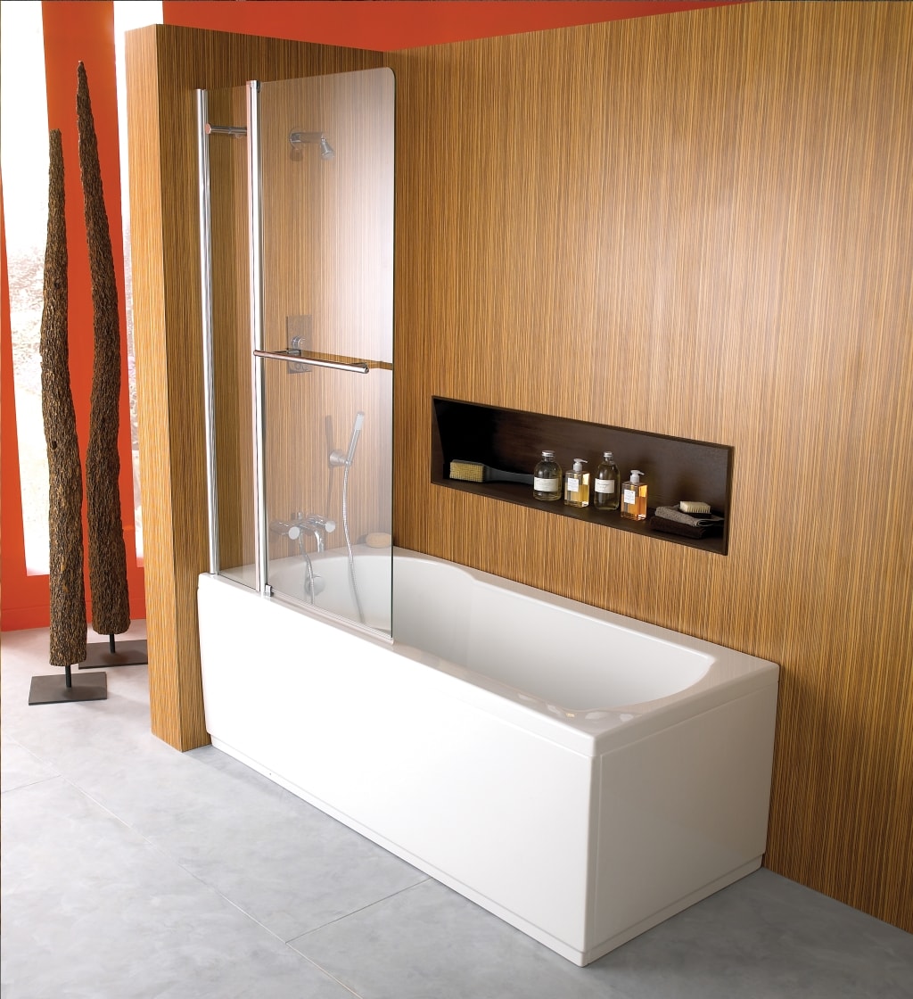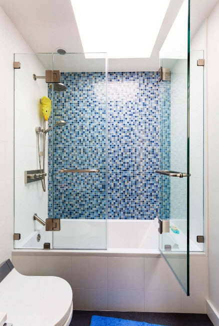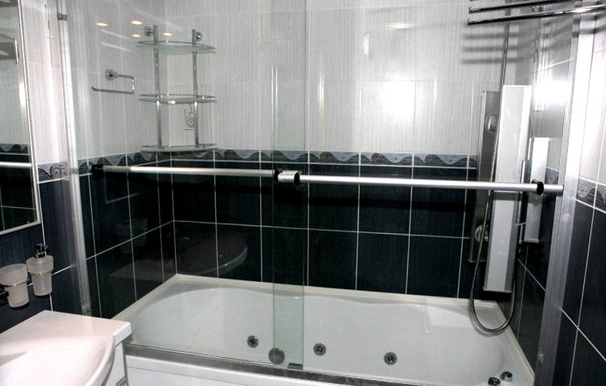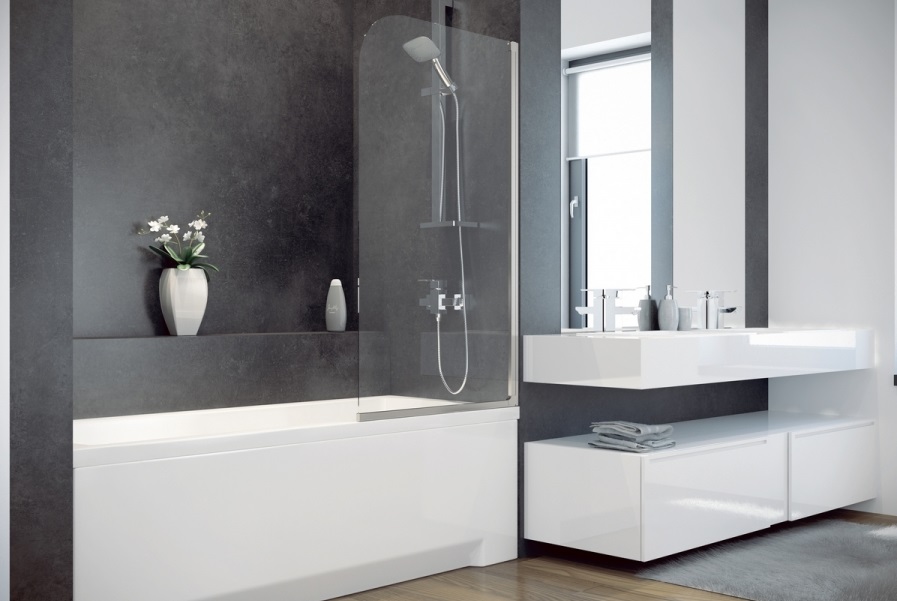 Los diseños transparentes son ideales para bañeras pequeñas. Si se combina el baño, las pantallas multicolores o con un acabado mate son las más adecuadas. Pero en este caso se requiere iluminación adicional.