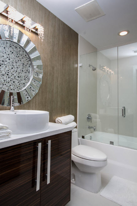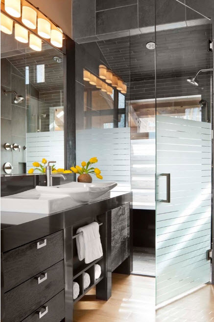 A una nota. El vidrio es ampliamente utilizado por los diseñadores en el diseño interior del baño.Los estantes, los sumideros de él tienen cada vez más demanda, a pesar del alto costo.
