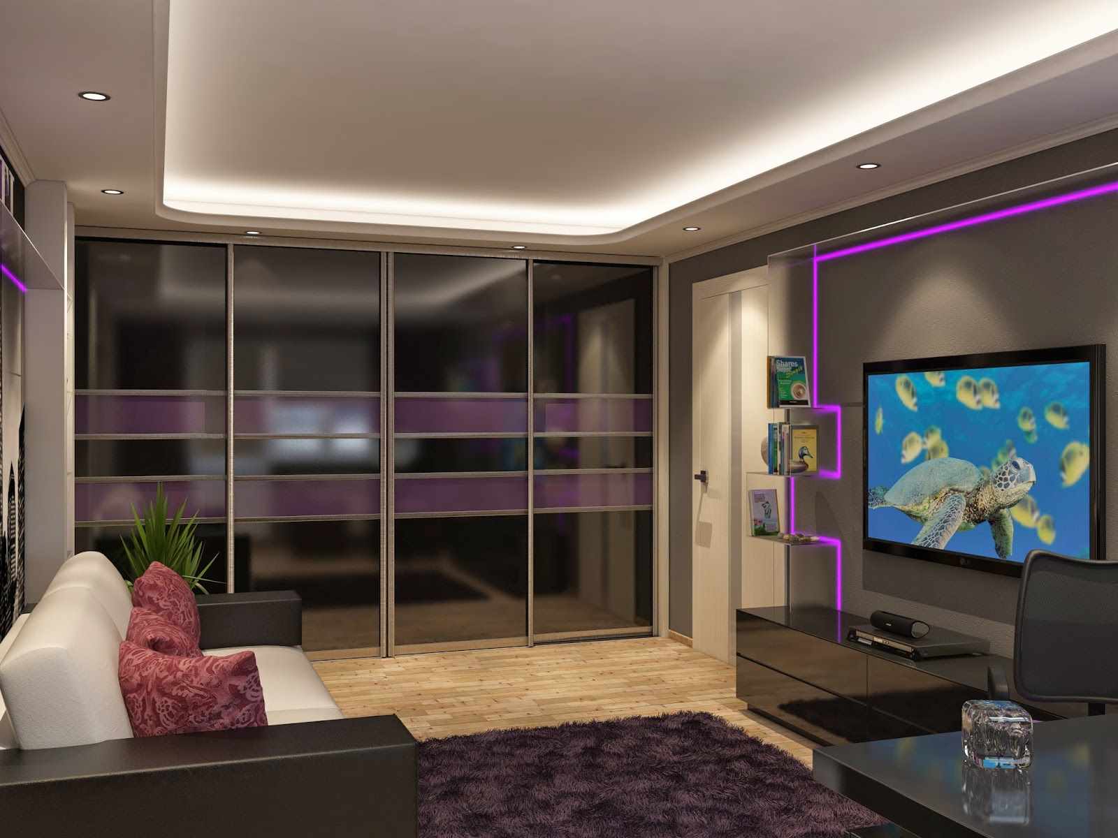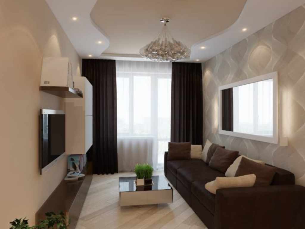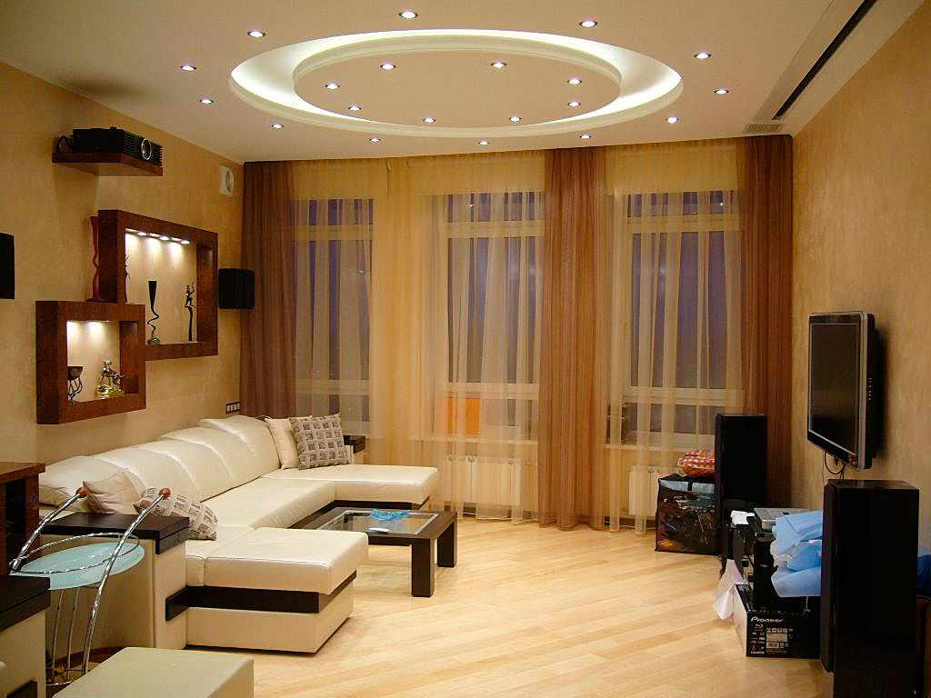 Aujourd'hui, les concepteurs proposent de nouvelles tendances, les meubles d'armoires dimensionnelles ne sont presque jamais utilisés, la tendance est aux étagères traversantes et aux modules d'étagères peu profonds. Au lieu d'un grand lustre dans la conception d'un salon de 16 mètres carrés. m. Le plus souvent, ils utilisent des plafonniers compacts, une bande de diode autour du périmètre ou des spots. Cela permet d'ajouter visuellement plus d'espace libre.