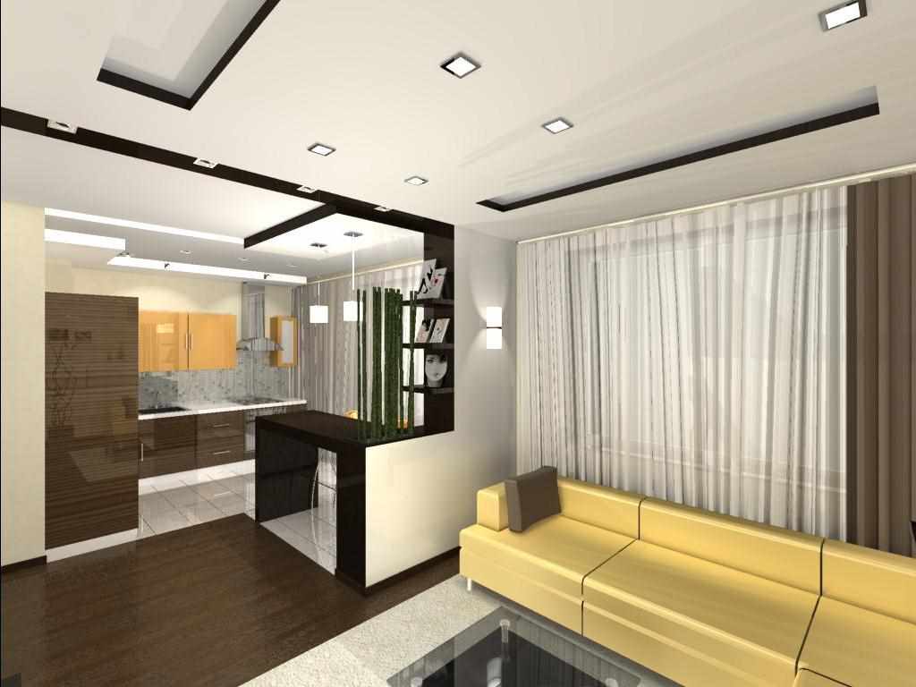 En plus de la séparation visuelle et de la séparation, vous pouvez utiliser des meubles multifonctionnels pliants et un podium. Il est très pratique lorsqu'un lit d'enfant est caché sur les roulettes dans une niche sous le podium, et qu'un lieu de travail ou une zone d'entraînement pour un enfant est équipé en haut. Cela se fait commodément le long du mur d'extrémité avec la fenêtre. Si le salon est relié à la cuisine et décoré dans un style moderne, un bar est souvent utilisé entre la pièce principale et l'unité de cuisson.