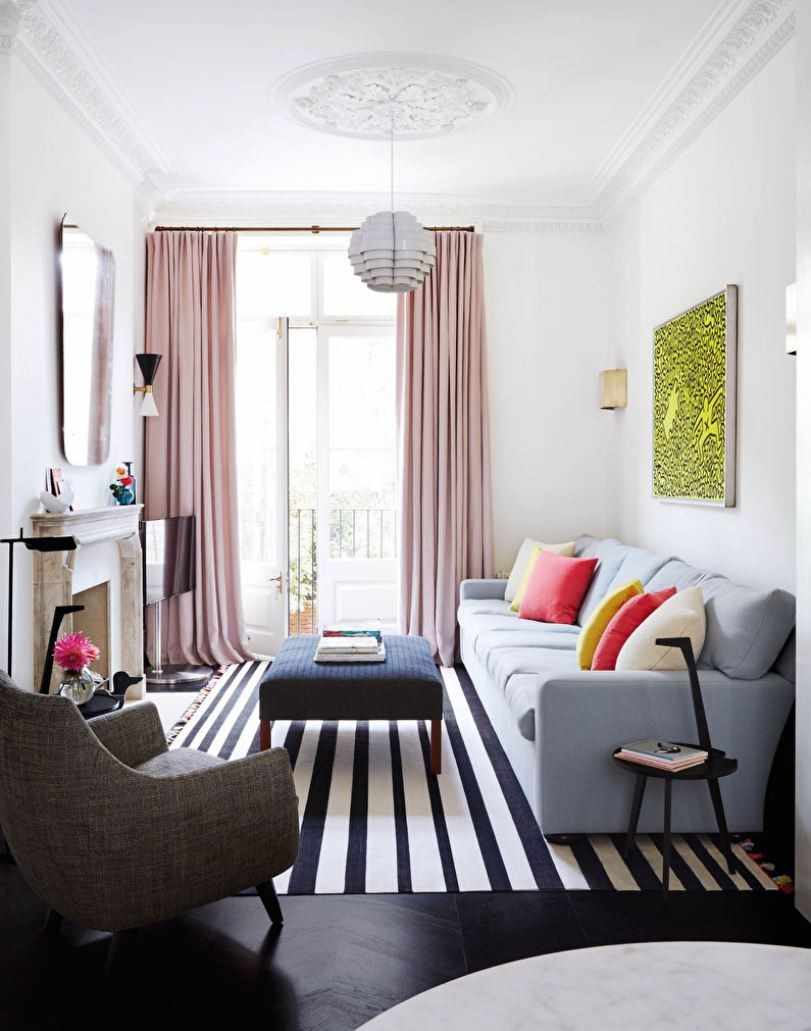 Parfois, il est nécessaire de fixer et de diluer l'intérieur pâle monophonique. Pour ce faire, utilisez les mêmes méthodes, mais il est plus facile de varier les textiles, y compris les tapis et rideaux lumineux, les couvre-lits et les coussins de canapé.