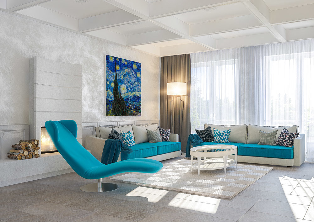- Le bleu aura fière allure dans le salon, dont les fenêtres font face au côté sud.