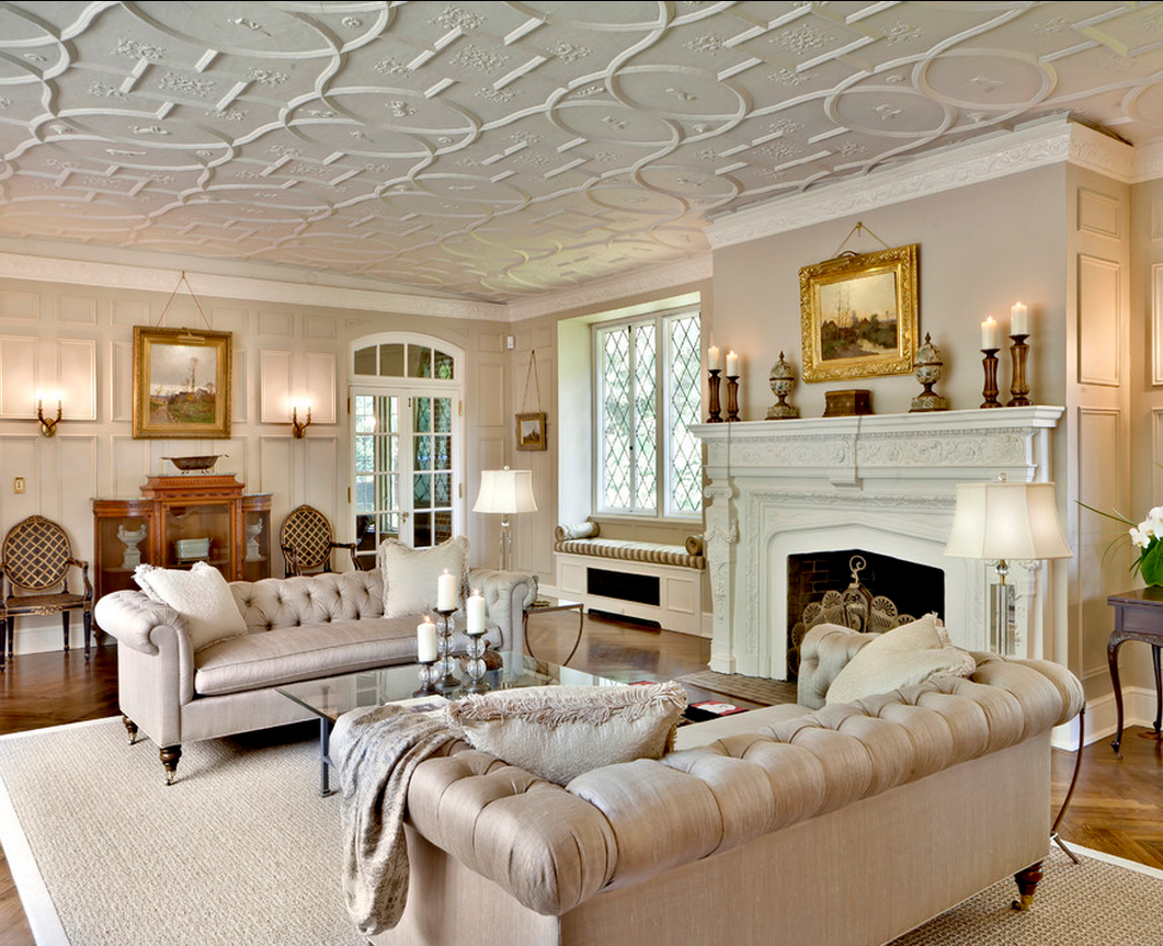 Le plafond doit également être de couleurs vives ou blanc. Il peut être tendu ou blanchi (peint) dans une teinte claire. L'utilisation de cloisons sèches, qui peut être faite à plusieurs niveaux ou avec une niche pour un lustre, ira bien avec le style classique.