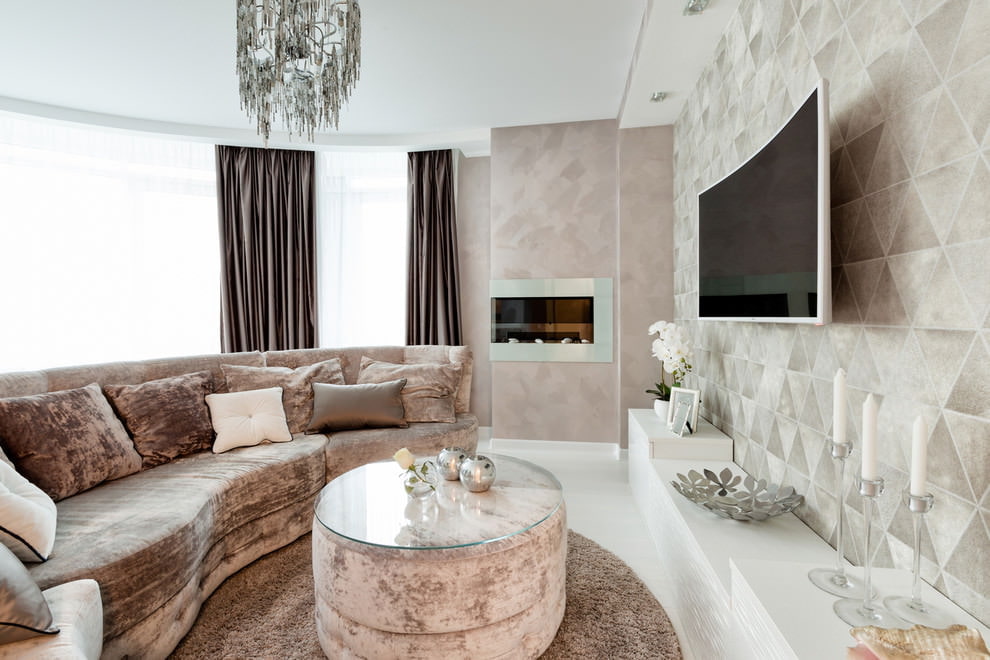 Lors de la décoration, il est très important d'utiliser des matériaux de haute qualité qui doivent correspondre et s'adapter au style et à l'intérieur choisis du salon dans des couleurs vives. Cette conception doit être l'arrière-plan et ne pas distraire l'attention générale, qui devrait être accordée principalement aux meubles et autres objets de décoration.