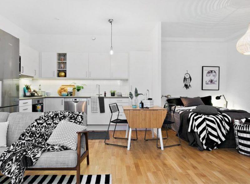 Une attention particulière est portée aux meubles de la chambre et du salon. Il doit être universel, se replier ou se cacher dans des niches. Tout espace pouvant être utilisé pour le stockage du linge et des objets doit être utilisé sans faute.
