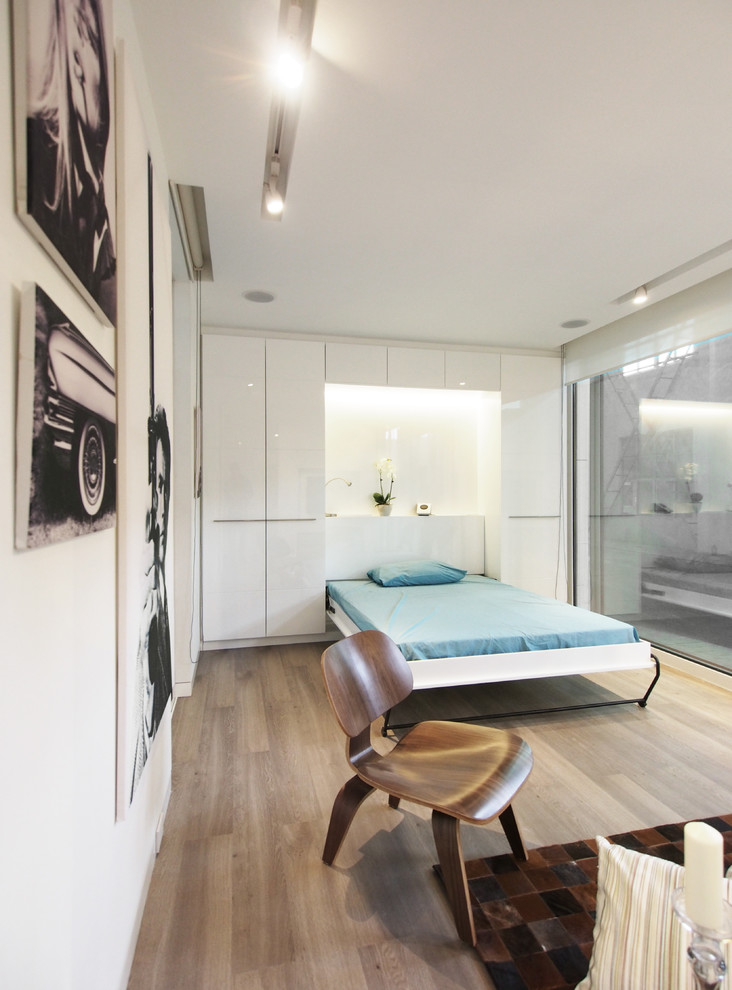 Le design de la chambre combiné avec le salon high-tech est un bon choix. Des couleurs calmes, exprimées dans des tons blancs, gris, foncés, avec des accents doux contribuent à l'harmonie intérieure. La simplicité de la décoration de l'intérieur de la chambre donne à l'espace une largeur supplémentaire. L'utilisation répandue de surfaces brillantes augmente visuellement l'espace. Le brillant est particulièrement adapté comme matériau pour le plafond.