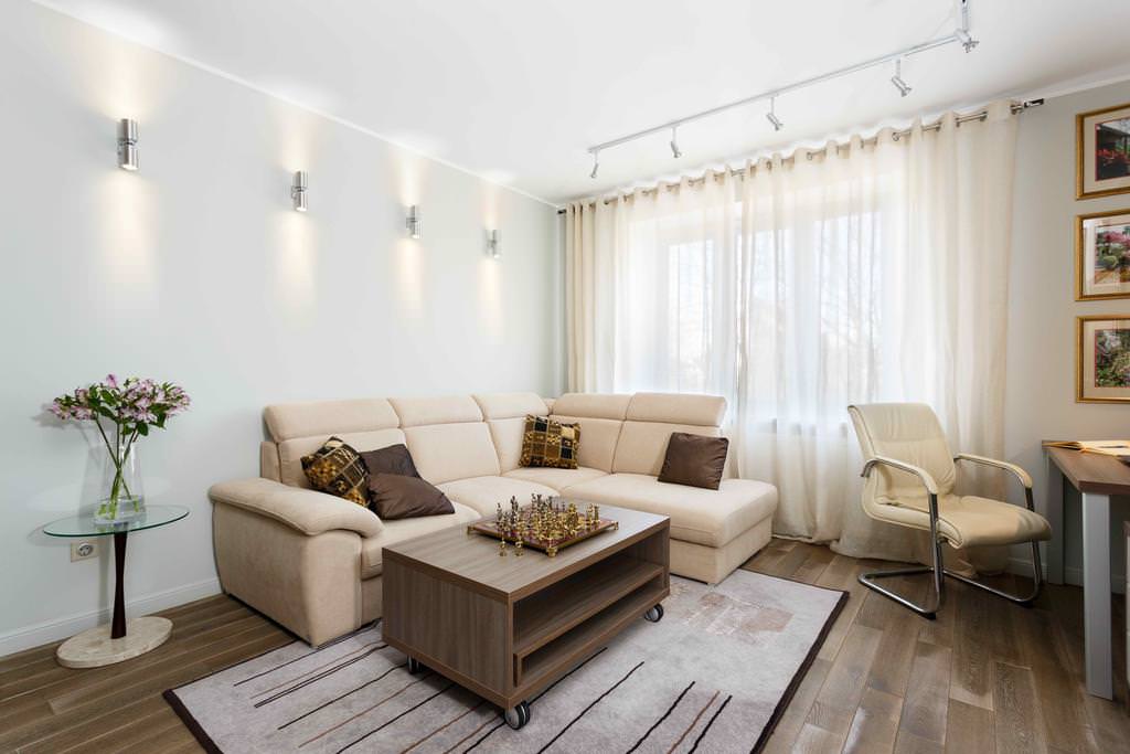 Les rideaux à l'intérieur du salon beige doivent être laiteux et bruns pour compléter le style de la pièce.